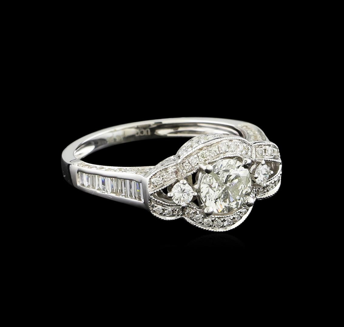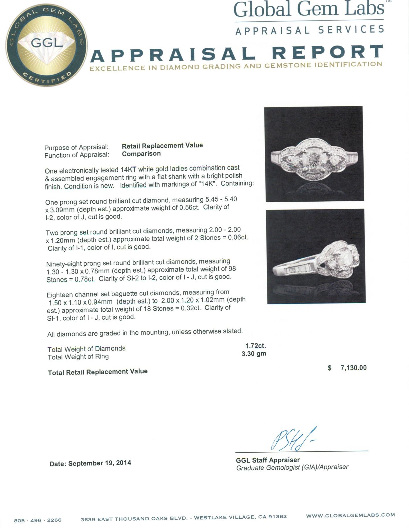 One electronically tested 14KT white gold ladies combination cast & assembled engagement ring with a flat shank with a bright polish finish. Identified with markings of "14K". Condition is new. Containing: One prong set round brilliant cut diamond, measuring 5.45 - 5.40 x 3.09mm (depth est.) approximate weight of 0.56ct. Clarity: I-2. Color: J, Cut is Good. Two prong set round brilliant cut diamonds, measuring 2.00 - 2.00 x 1.20mm (depth est.) approximate total weight of 2 Stones = 0.06ct. Clarity: I-1. Color: I, Cut is Good. Ninety-Eight prong set round brilliant cut diamonds, measuring 1.30 - 1.30 x 0.78mm (depth est.) approximate total weight of 98 Stones = 0.78ct. Clarity: SI-2 to I-2. Color: I - J, Cut is Good. Eighteen channel set baguette cut diamonds, measuring from 1.50 x 1.10 x 0.94mm (depth est.) to 2.00 x 1.20 x 1.02mm (depth est.) approximate total weight of 18 Stones = 0.32ct. Clarity: SI-1. Color: I - J, Cut is Good. All diamonds are graded in the mounting, unless otherwise stated. Total Weight of Diamonds 1.72ct. Total Weight of Ring 3.30 grams. GGL Appraised.