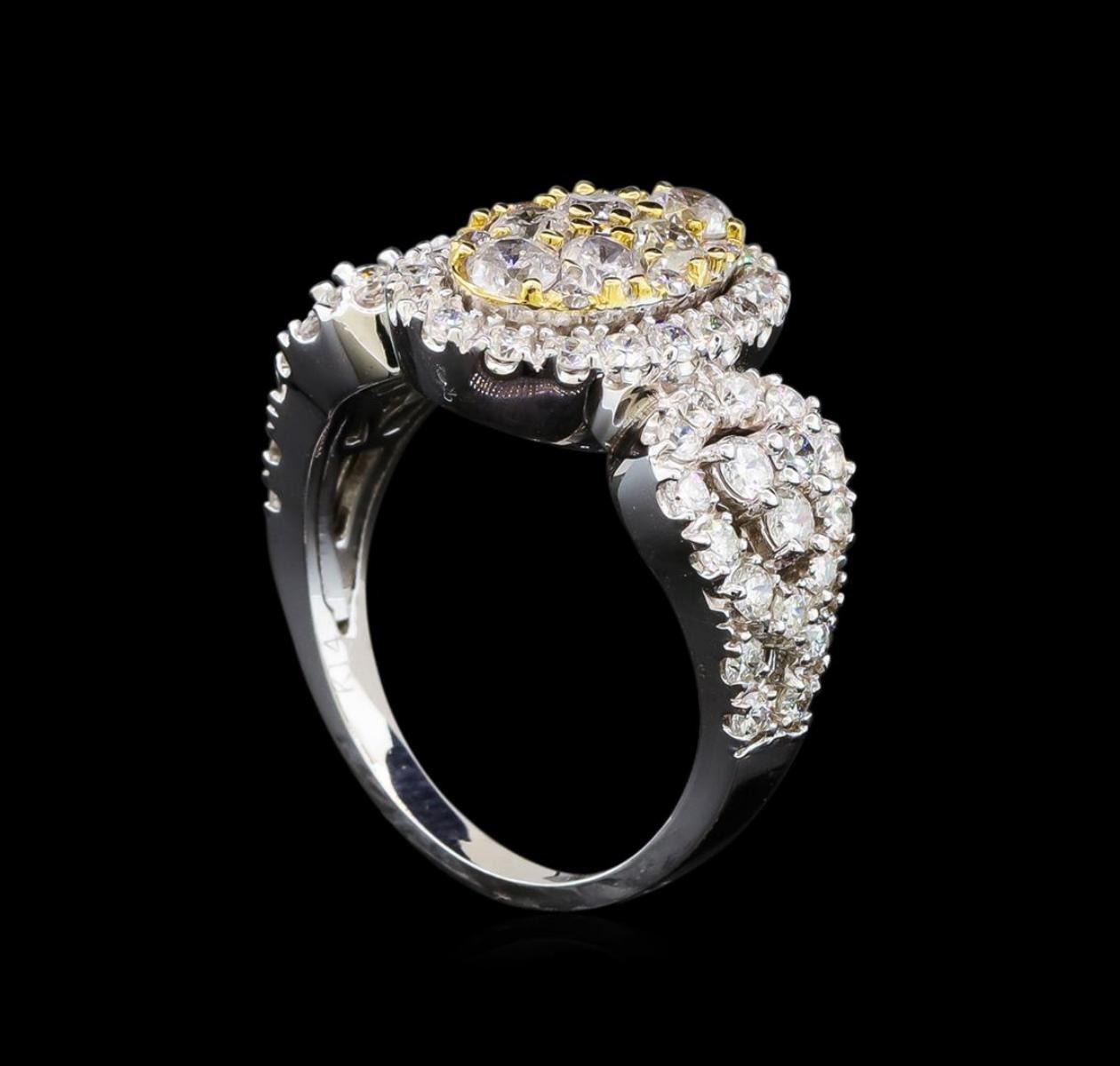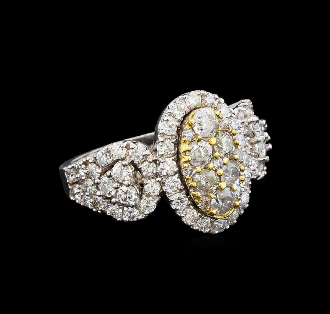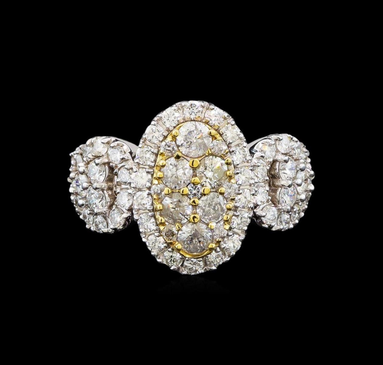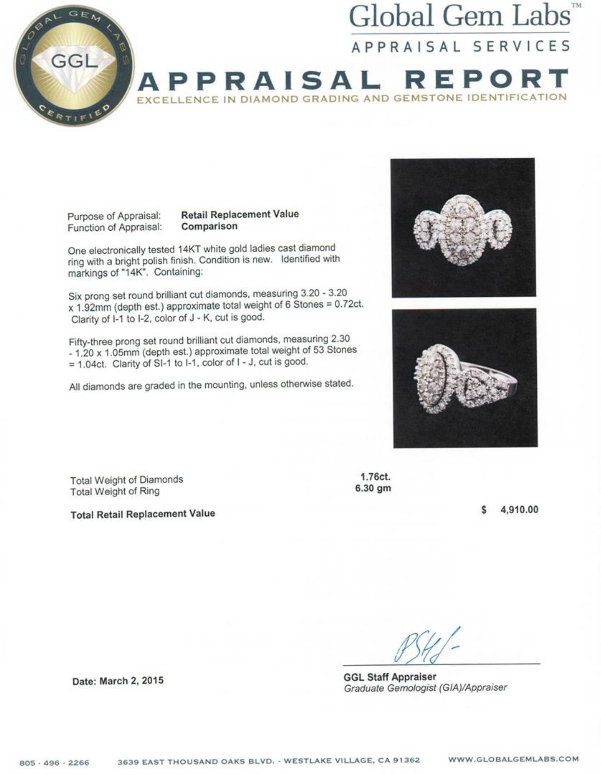 One electronically tested 14KT white gold ladies cast diamond ring with a bright polish finish. Identified with markings of "14K". Condition is new. Containing: Six prong set round brilliant cut diamonds, measuring 3.20 - 3.20 x 1.92mm (depth est.) approximate total weight of 6 Stones = 0.72ct. Clarity: I-1 to I-2. Color: J - K, Cut is Good. Fifty-Three prong set round brilliant cut diamonds, measuring 2.30 - 1.20 x 1.05mm (depth est.) approximate total weight of 53 Stones = 1.04ct. Clarity: SI-1 to I-1. Color: I - J, Cut is Good. All diamonds are graded in the mounting, unless otherwise stated. Total Weight of Diamonds 1.76ct. Total Weight of Ring 6.30 grams. GGL Appraised.