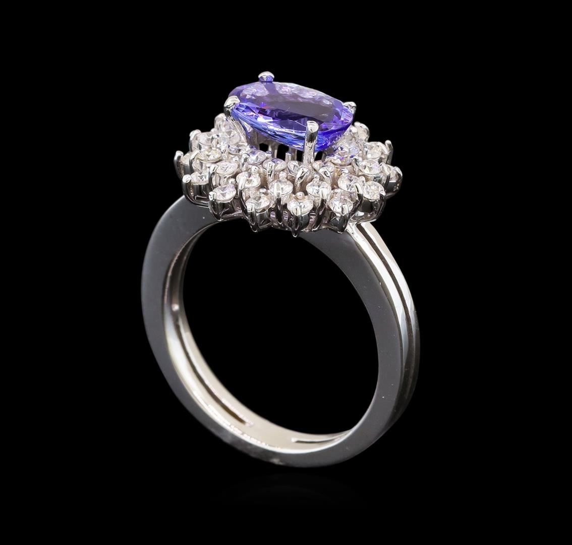 One electronically tested 14KT white gold ladies cast tanzanite and diamond ring with a bright polish finish. Identified with markings of "K14". Condition is new. Containing: One prong set oval modified brilliant cut natural tanzanite, measuring 8.90 x 6.80 x 4.20mm, approximate weight of 1.79ct., clarity is eye clean, type I, medium light, very slightly grayish, violet color, (GIA V 4/3), cut is good. Forty-Two prong set round brilliant cut diamonds, measuring 1.50 - 1.30 x 0.84mm (depth est.) approximate total weight of 42 Stones = 0.42ct. Clarity: SI-1 to SI-2. Color: H - I, Cut is Good. Colored gemstones are presumed to have been subjected to commonly used enhancement processes. All diamonds and colored gemstones are graded in the mounting, unless otherwise stated. Total Weight of Colored Stones 1.79ct. Total Weight of Diamonds 0.42ct. Total Weight of Ring 5.10 grams. GGL Appraised.
