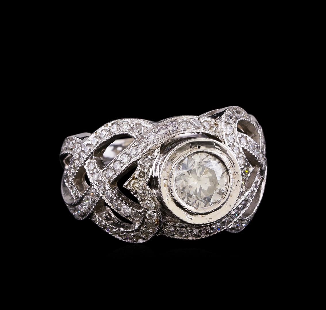 One electronically tested 14KT white gold ladies combination cast & assembled engagement ring with a flat shank with a bright polish finish. Identified with markings of "K14". Condition is new. Containing: One bezel set round brilliant cut diamond, measuring 6.50 - 6.50 x 4.00mm (depth est.) approximate weight of 1.03ct. Clarity: I-1. Color: K, Cut is Good. One Hundred Twenty-Four prong set round brilliant cut diamonds, measuring 1.20 - 1.20 x 0.72mm (depth est.) approximate total weight of 124 Stones = 0.78ct. Clarity: SI-2 to I-1. Color: I - J, Cut is Good. All diamonds are graded in the mounting, unless otherwise stated. Total Weight of Diamonds 1.81ct. Total Weight of Ring 8.80 grams. GGL Appraised at $14,515.00.
