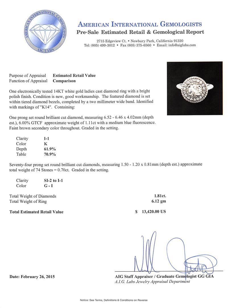One electronically tested 14KT white gold ladies cast diamond ring with a bright polish finish. The featured diamond is set within tiered diamond bezels, completed by a two millimeter wide band. Identified with markings of "K14". Condition is new, good workmanship. Containing: One prong set round brilliant cut diamond, measuring 6.52 - 6.46 x 4.02mm (depth est.), 6.00.% GTCF approximate weight of 1.11ct with a medium blue fluorescence. Faint brown secondary color throughout. Graded in the setting. Clarity: I-1. Color: K. Depth 61.9%. Table 70.9%. Seventy-Four prong set round brilliant cut diamonds, measuring 1.50 - 1.20 x 0.81mm (depth est.) approximate total weight of 74 Stones = 0.70ct. Graded in the setting. Clarity: SI-2 to I-1. Color: G - I. Total Weight of Diamonds 1.81ct. Total Weight of Ring 6.12 grams. AIG Appraised at $13,420.00.