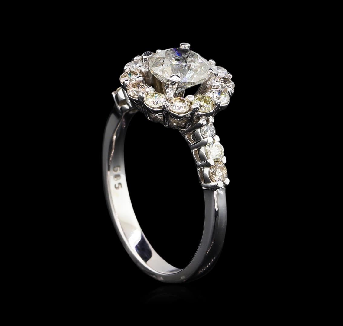 One electronically tested 14KT white gold ladies cast diamond unity ring with a bright polish finish. Condition is new, good workmanship. The featured diamond is set within a diamond bezel supported by diamond set shoulders, completed by a two and one-half millimeter wide band. Identified with markings of "585". Containing: One prong set round brilliant cut diamond, measuring 6.15 - 6.10 x 4.10mm (depth est.), 5.00.%. GTCF approximate weight of 1.10ct. Graded in the setting. Clarity: I-2. Color: JDepth 66.9%. Table 57.1%. Eighteen prong set round brilliant cut diamonds, measuring 2.50 - 1.80 x 1.29mm (depth est.) approximate. Total Weight of 18 Stones = 0.73ct. Graded in the setting. Clarity: I-1 to I-2. Color: I - K. Total Weight of Diamonds 1.83ct. Total Weight of Ring 3.96 grams. AIG Appraised.