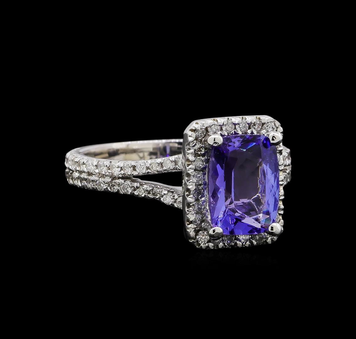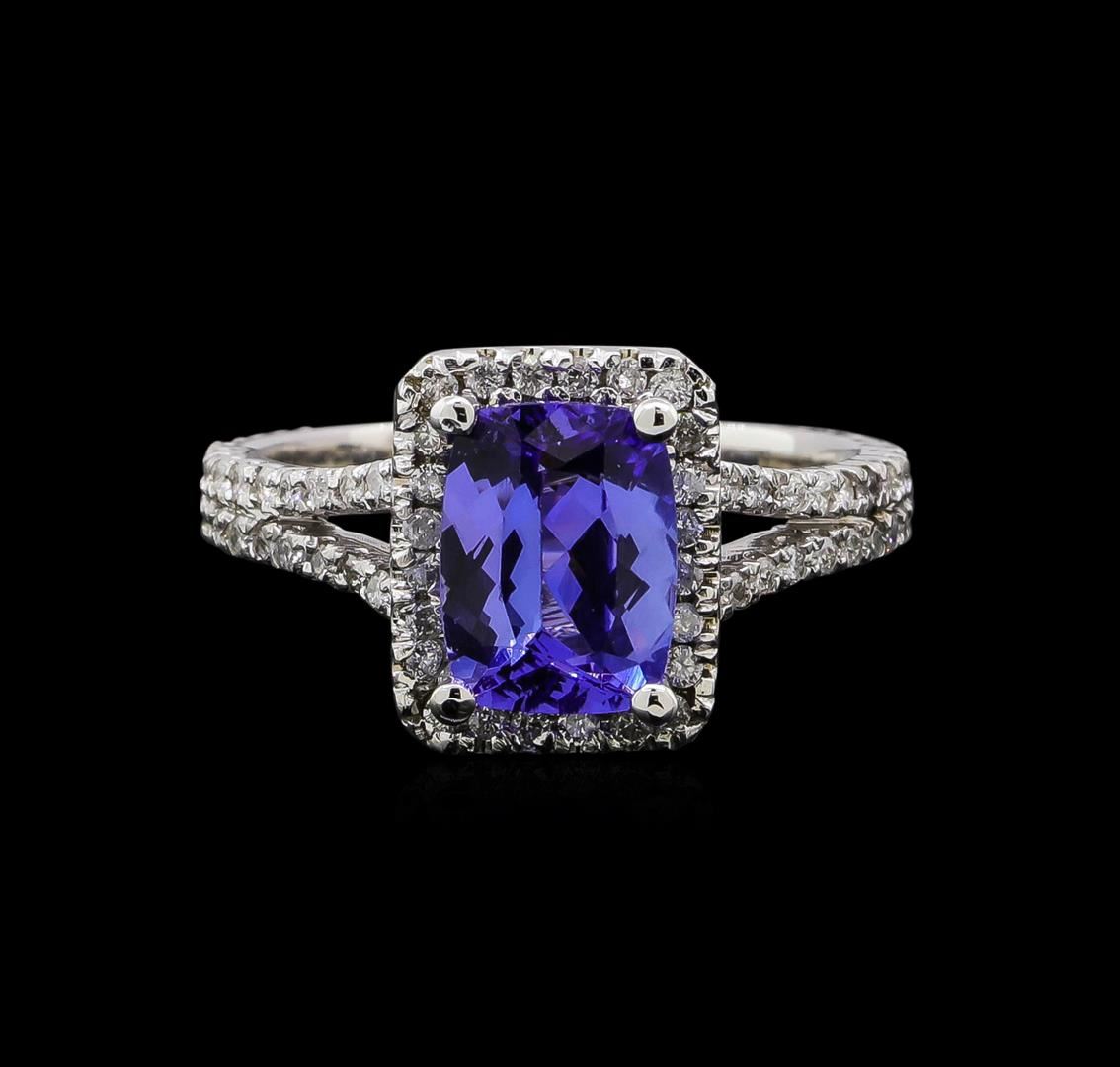 One electronically tested 14KT white gold ladies cast tanzanite and diamond ring with a bright polish finish. Identified with markings of "14KT". Condition is new. Containing: One prong set rectangular cushion modified brilliant cut natural tanzanite, measuring 8.54 x 6.47 x 4.21mm, approximate weight of 1.83ct., clarity is eye clean, type I, medium light, very slightly grayish, violet color, (GIA V 4/3), cut is very good. Eighty-Four prong set round brilliant cut diamonds, measuring 1.30 - 1.30 x 0.78mm (depth est.) approximate total weight of 84 Stones = 0.67ct. Clarity: SI-2 to I-1. Color: J, Cut is Good. Colored gemstones are presumed to have been subjected to commonly used enhancement processes. All diamonds and colored gemstones are graded in the mounting, unless otherwise stated. Total Weight of Colored Stones 1.83ct. Total Weight of Diamonds 0.67ct. Total Weight of Ring 4.00 grams. GGL Appraised.