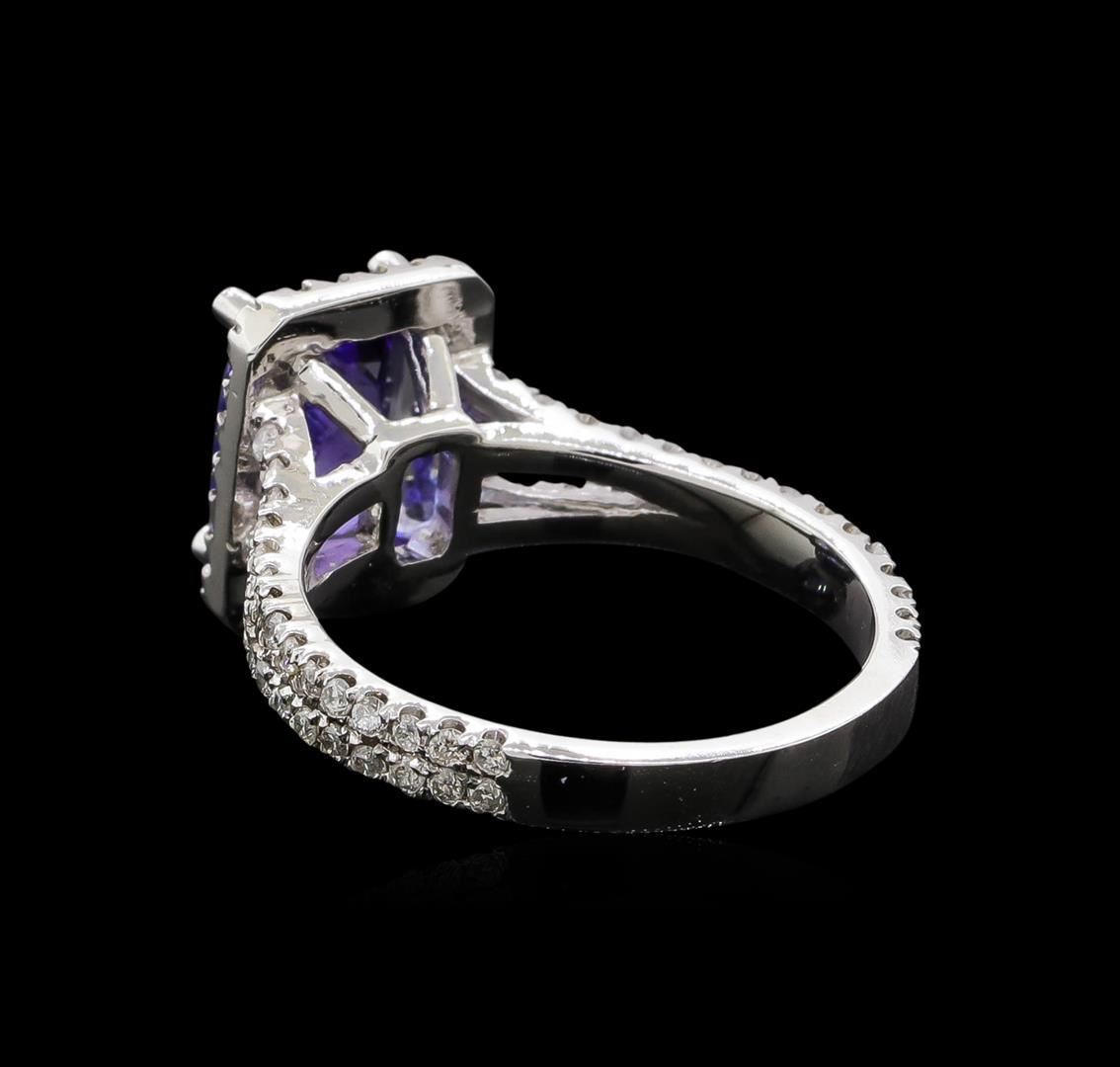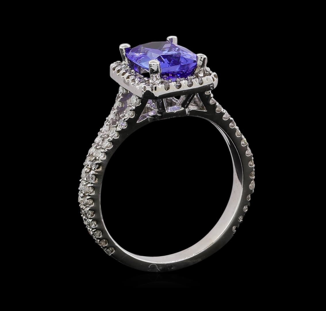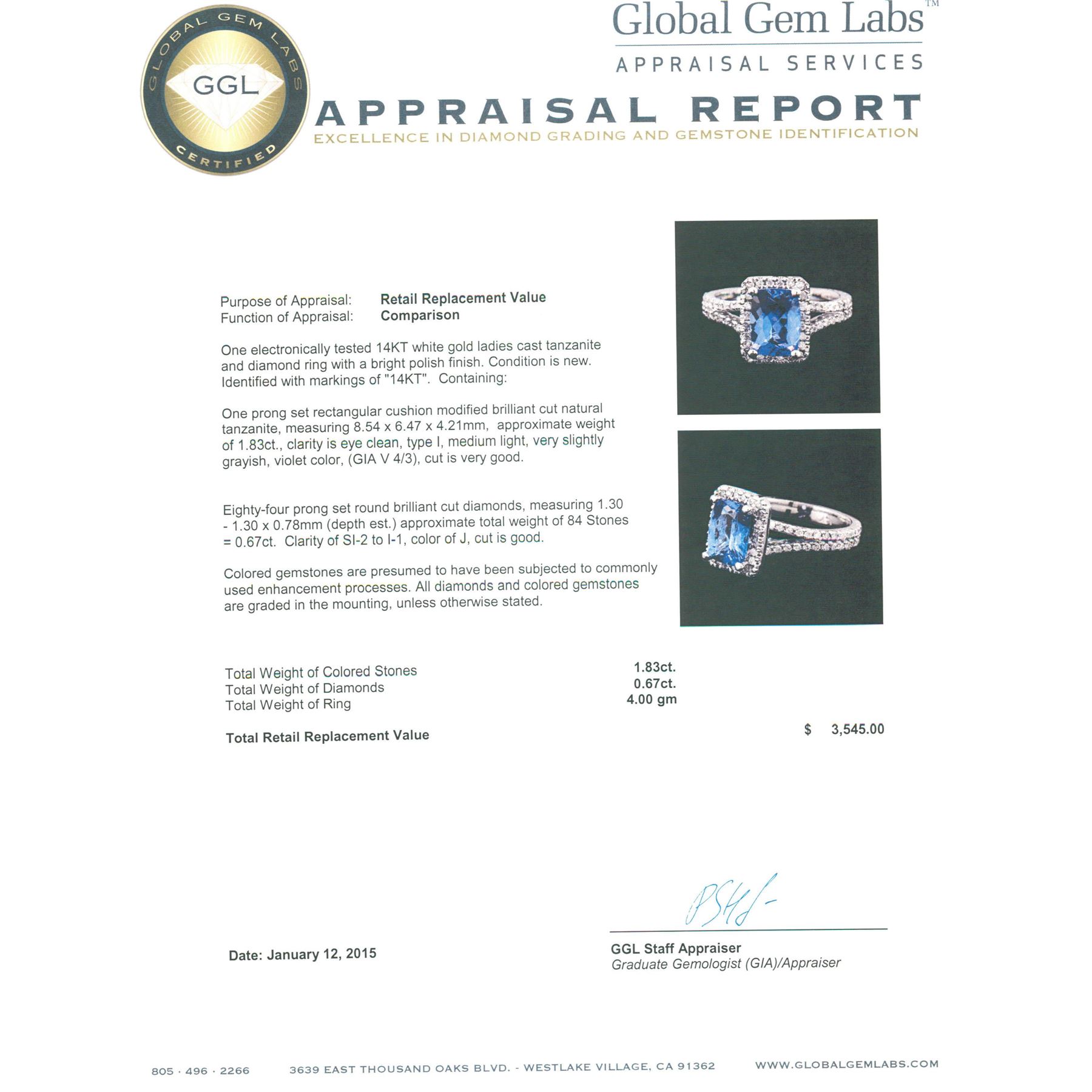 One electronically tested 14KT white gold ladies cast tanzanite and diamond ring with a bright polish finish. Identified with markings of "14KT". Condition is new. Containing: One prong set rectangular cushion modified brilliant cut natural tanzanite, measuring 8.54 x 6.47 x 4.21mm, approximate weight of 1.83ct., clarity is eye clean, type I, medium light, very slightly grayish, violet color, (GIA V 4/3), cut is very good. Eighty-Four prong set round brilliant cut diamonds, measuring 1.30 - 1.30 x 0.78mm (depth est.) approximate total weight of 84 Stones = 0.67ct. Clarity: SI-2 to I-1. Color: J, Cut is Good. Colored gemstones are presumed to have been subjected to commonly used enhancement processes. All diamonds and colored gemstones are graded in the mounting, unless otherwise stated. Total Weight of Colored Stones 1.83ct. Total Weight of Diamonds 0.67ct. Total Weight of Ring 4.00 grams. GGL Appraised.