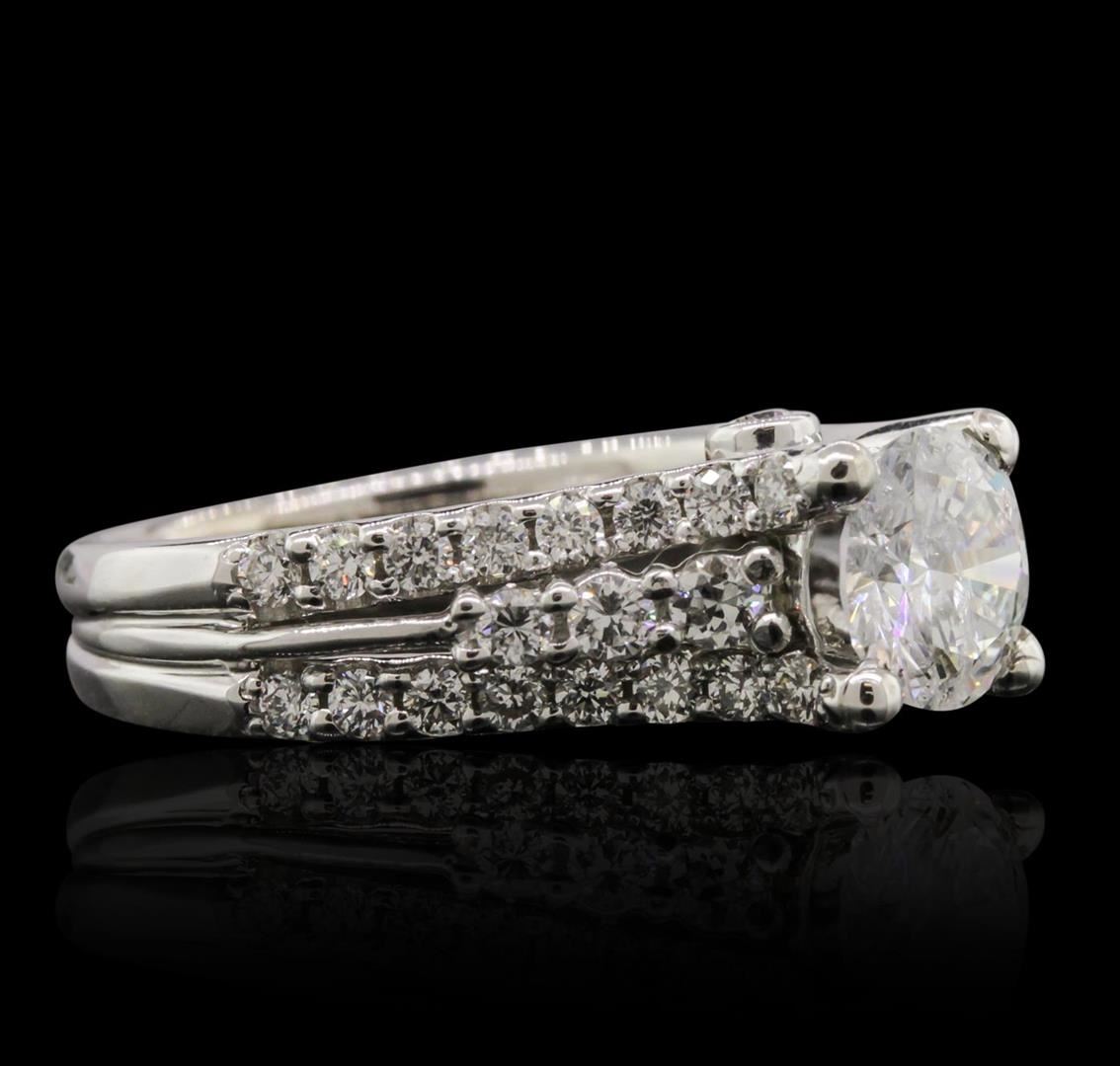 One electronically tested 14KT white gold Ladies combination cast & assembled engagement ring with a bright polish finish. Condition is new. Identified with markings of "14K". Containing: One prong set round brilliant cut diamond, measuring 6.72 - 6.71 x 3.81mm (depth est.) approximate. Total Weight of 1.04ct. Clarity: I-3. Color: F, Cut is Good. Forty-Four prong set round brilliant cut diamonds, measuring 1.90 - 1.50 x 1.02mm (depth est.) approximate. Total Weight of 44 Stones = 0.83ct. Clarity: VS-2 to SI-2. Color: F - G, Cut is Good. EGL USA GEM ID# US 911348427D. All diamonds are graded in the mounting, unless otherwise stated. Total Weight of Diamonds 1.87ct. Total Weight of Engagement Ring 5.50 grams. GGL Appraised.