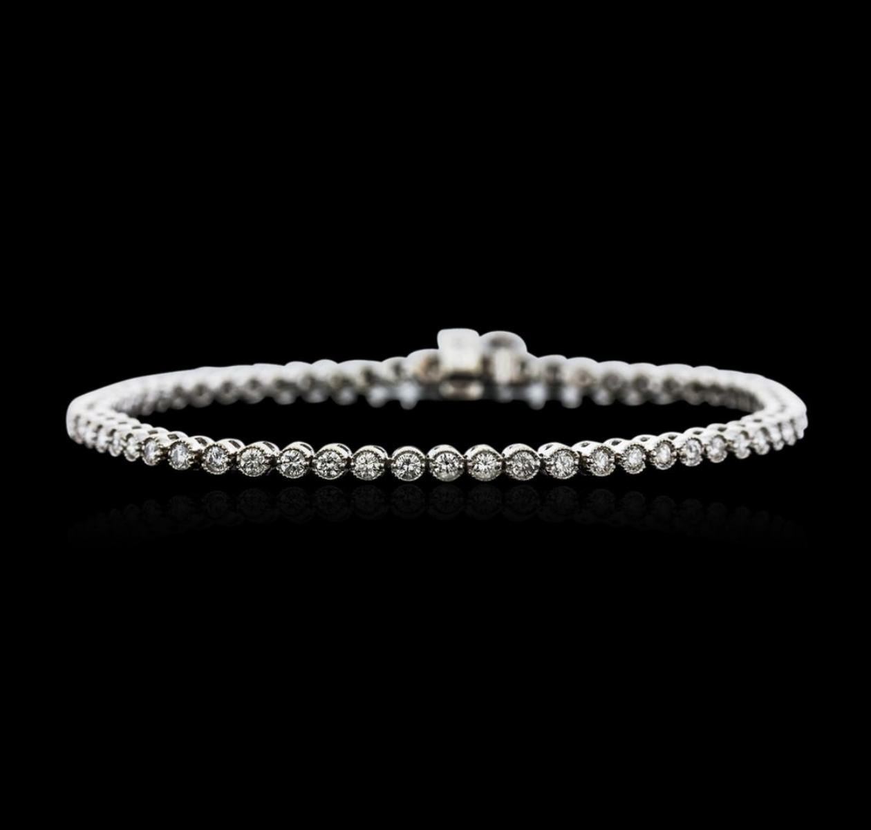 One electronically tested 14KT white gold ladies cast diamond tennis bracelet with a hidden box clasp with safety closer with a bright polish finish. Measurements: 7" in length Identified with markings of "14K". Condition is new. Containing: Sixty-Four prong set round brilliant cut diamonds, measuring 2.00 - 2.00 x 1.20mm (depth est.) approximate total weight of 64 Stones = 1.87ct. Clarity: SI-1 to SI-2. Color: H - I, Cut is Good. All diamonds are graded in the mounting, unless otherwise stated. Total Weight of Diamonds 1.87ct. Total Weight of Tennis Bracelet 9.80 grams. GGL Appraised at $5,875.00.