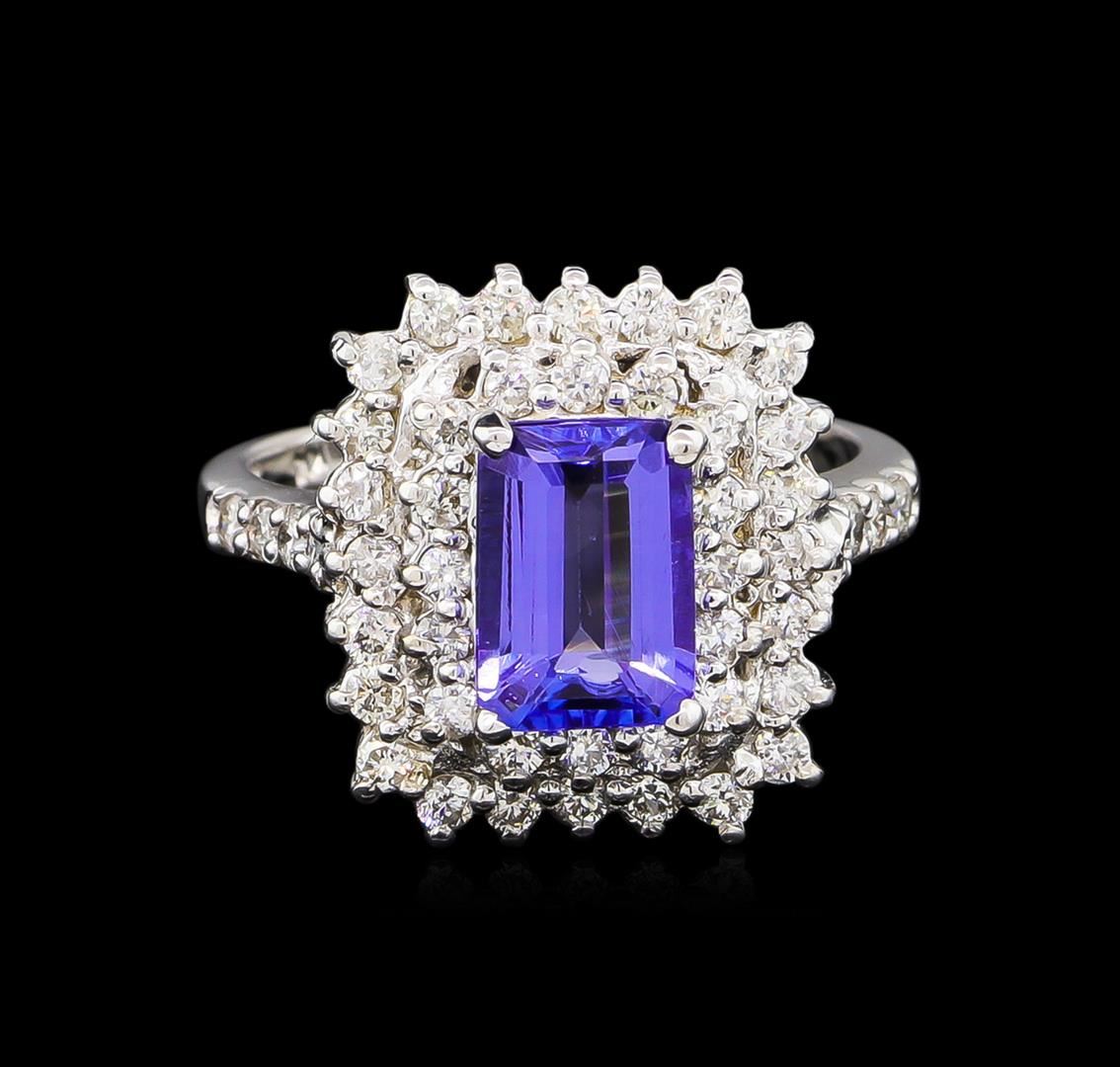 One electronically tested 14KT white gold ladies cast tanzanite and diamond ring with a bright polish finish. The featured tanzanite is set within two tiered diamond bezels supported by diamond set shoulders, completed by two millimeter wide band. Identified with markings of "K14". Condition is new, good workmanship. Containing: One prong set rectangular step cut natural tanzanite, measuring 8.70 x 6.10 x 3.70mm, approximate weight of 1.88ct., clarity is slightly included, type I, medium dark, very slightly grayish, bluish violet color, (GIA bV 6/3), cut is good. Transmitting light with no distortion, transparent. Graded in the setting.Tanzanite is a very rare gemstone that is only found in the country of Tanzania. Originally discovered in 1967. Tiffany & Company, named the stone Tanzanite. It is found in the Usumburu Mountains that border the Umba Valley of northern Tanzania. Tanzanite occurs in gray, brown, violet, blue, reddish-purple, & green. The gem is interesting because of its exceptional pleochroism. Rotated in different directions a tanzanite will exhibit multiple changes of color. Tanzanite has a low tolerance to ultrasonic cleaning, and should not be cleaned using this method.Forty-Eight prong set round brilliant cut diamonds, measuring 1.70 - 1.70 x 1.02mm (depth est.) approximate. Total Weight of 48 Stones = 0.89ct. Graded in the setting. Clarity: SI-1 to I-1 . Color: G - I. Total Weight of Colored Stones 1.88ct. Total Weight of Diamonds 0.89ct. Total Weight of Ring 6.01gm. AIG Appraised at $7,455.00.