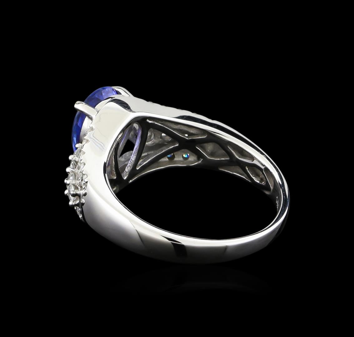 One electronically tested 14KT white gold ladies combination cast & assembled tanzanite and diamond ring with a split shank with a bright polish finish. Identified with markings of "14K". Condition is new. Containing: One prong set pear modified brilliant cut natural tanzanite, measuring 10.51 x 6.32 x 4.22mm, approximate weight of 1.88ct., clarity is eye clean, type I, medium, very slightly grayish, violet color, (GIA V 5/3), cut is good. Thirty-Two prong set round brilliant cut diamonds, measuring 2.10 - 1.50 x 1.08mm (depth est.) approximate total weight of 32 Stones = 0.50 ct. Clarity: I-1 to I-2. Color: I - J, Cut is Good. Colored gemstones are presumed to have been subjected to commonly used enhancement processes. All diamonds and colored gemstones are graded in the mounting, unless otherwise stated. Total Weight of Colored Stones 1.88ct. Total Weight of Diamonds 0.50 ct. Total Weight of Ring 4.70 grams. GGL Appraised.