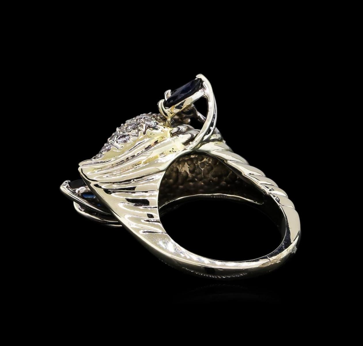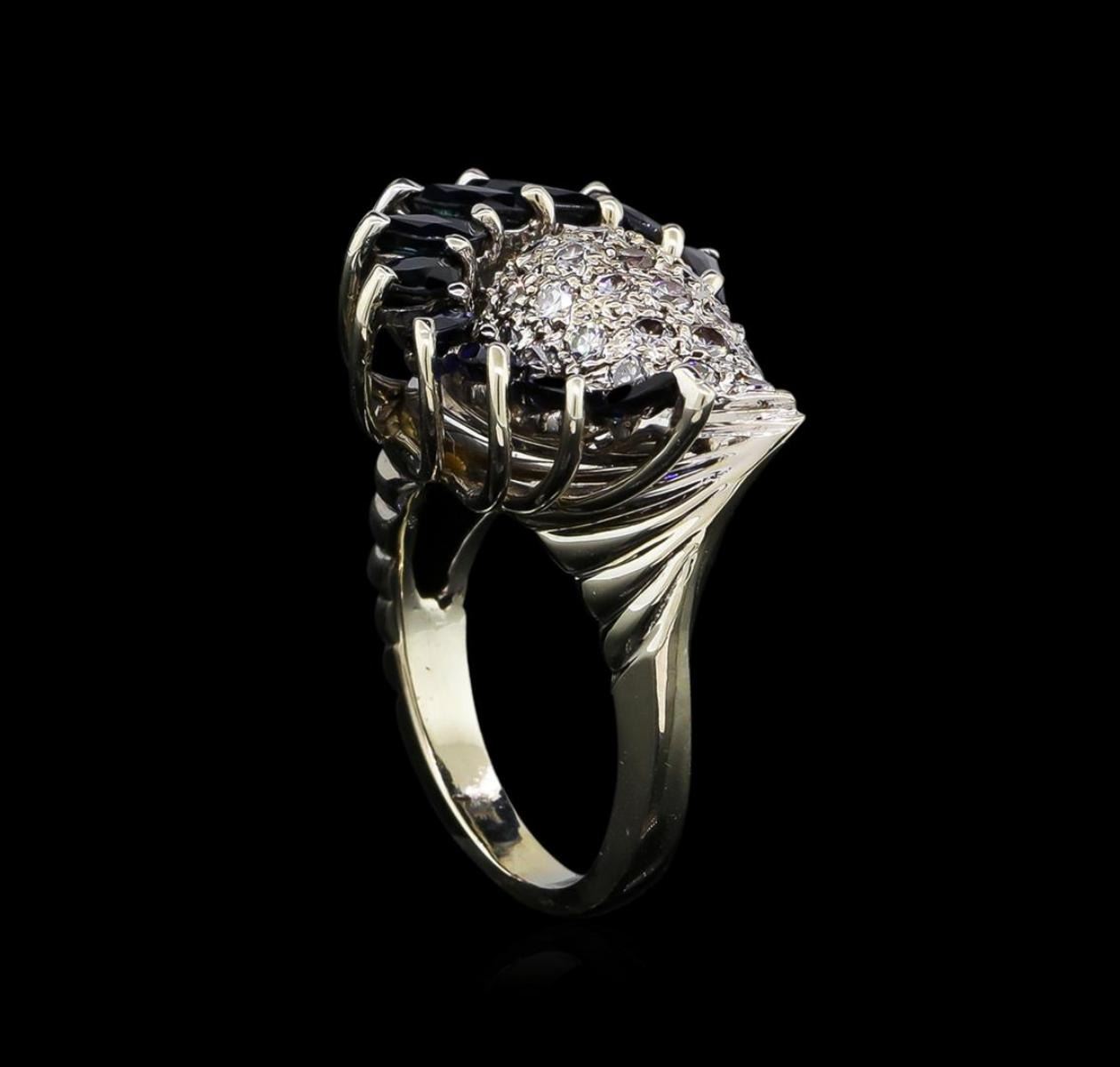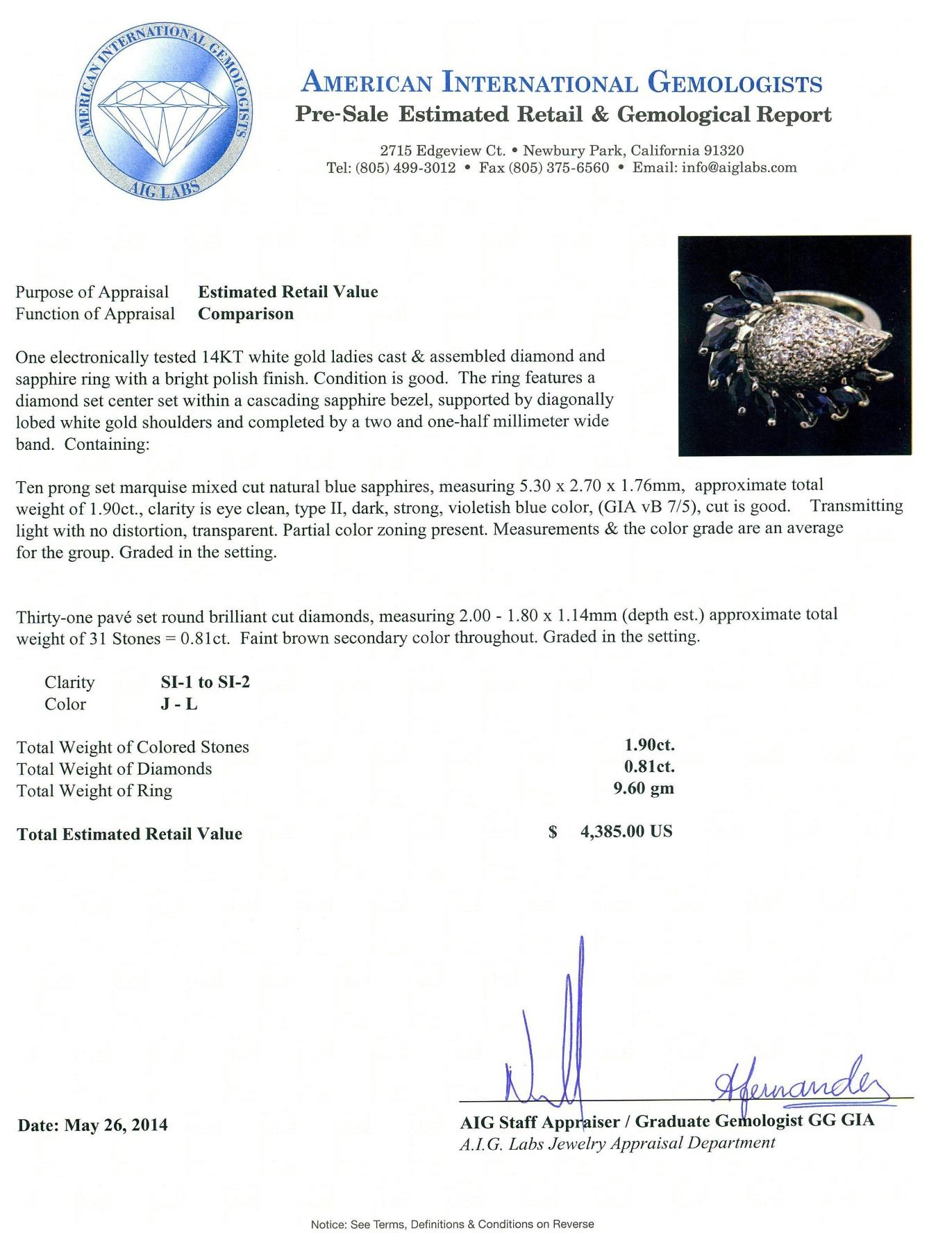 One electronically tested 14KT white gold ladies cast & assembled diamond and sapphire ring with a bright polish finish. Condition is good. The ring features a diamond set center set within a cascading sapphire bezel, supported by diagonally lobed white gold shoulders and completed by a two and one-half millimeter wide band. Containing: Ten prong set marquise mixed cut natural blue sapphires, measuring 5.30 x 2.70 x 1.76mm, approximate. Total Weight of 1.90 ct., clarity is eye clean, type II, dark, strong, violetish blue color, (GIA vB 7/5), cut is good. Transmitting light with no distortion, transparent. Partial color zoning present. Measurements & the color grade are an average for the group. Graded in the setting. Thirty-One pav, set round brilliant cut diamonds, measuring 2.00 - 1.80 x 1.14mm (depth est.) approximate. Total Weight of 31 Stones = 0.81ct. Faint brown secondary color throughout. Graded in the setting. Clarity: SI-1 to SI-2. Color: J - L. Total Weight of Colored Stones 1.90 ct. Total Weight of Diamonds 0.81ct. Total Weight of Ring 9.60 grams. AIG Appraised.