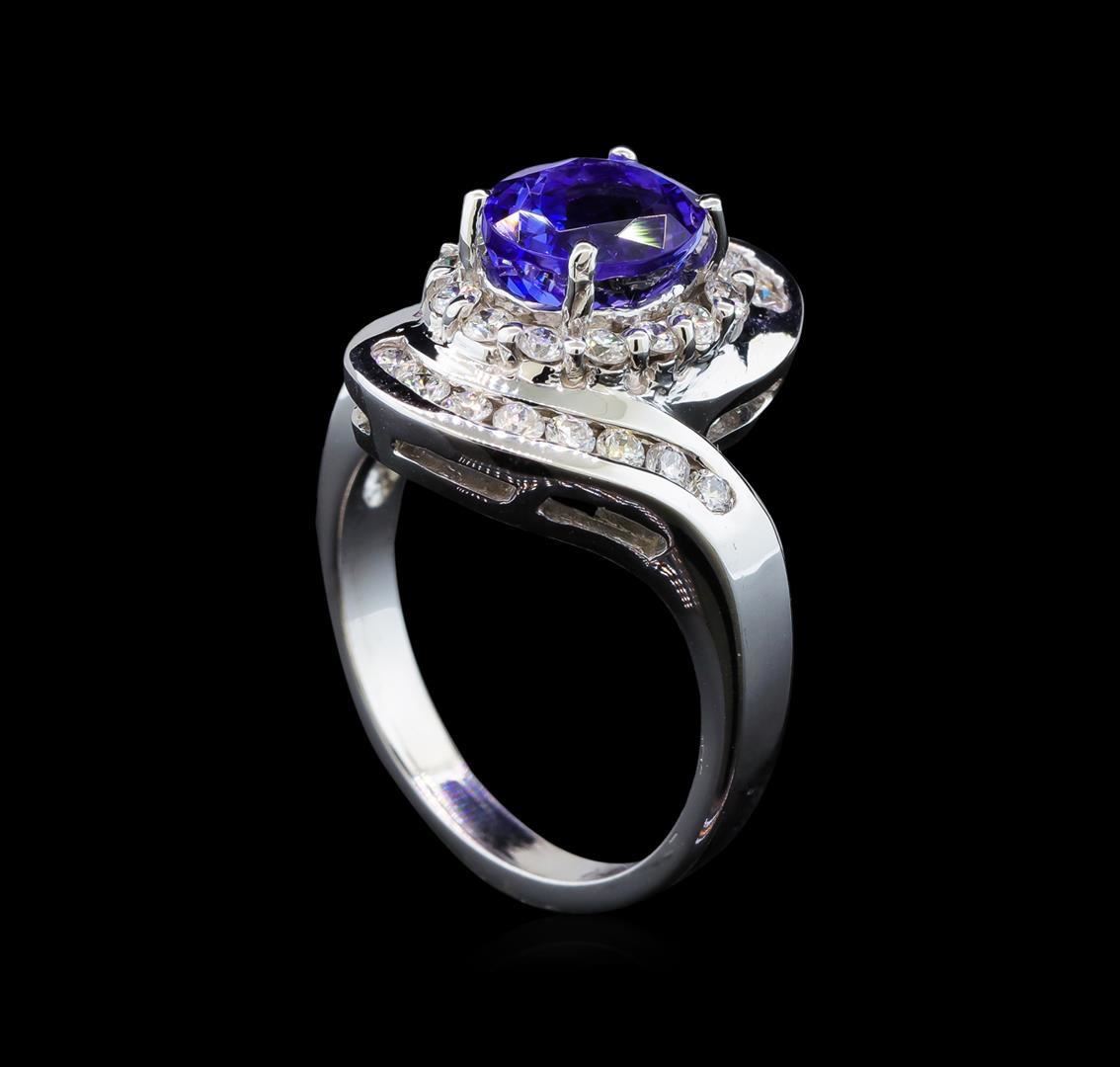 One electronically tested 14KT white gold ladies cast tanzanite and diamond ring with a bright polish finish. Identified with markings of "14K". Condition is new. Containing: One prong set oval modified brilliant cut natural tanzanite, measuring 8.00. x 7.00. x 4.85mm, approximate weight of 1.91ct., clarity is eye clean, type I, medium light, very slightly grayish, violet color, (GIA V 4/3), cut is good. Thirty prong set round brilliant cut diamonds, measuring 1.80 - 1.80 x 1.08mm (depth est.) approximate total weight of 30 Stones = 0.64ct. Clarity: SI-1 to SI-2. Color: H - I, Cut is Good. Colored gemstones are presumed to have been subjected to commonly used enhancement processes. All diamonds and colored gemstones are graded in the mounting, unless otherwise stated. Total Weight of Colored Stones 1.91ct. Total Weight of Diamonds 0.64ct. Total Weight of Ring 7.70 grams. GGL Appraised.
