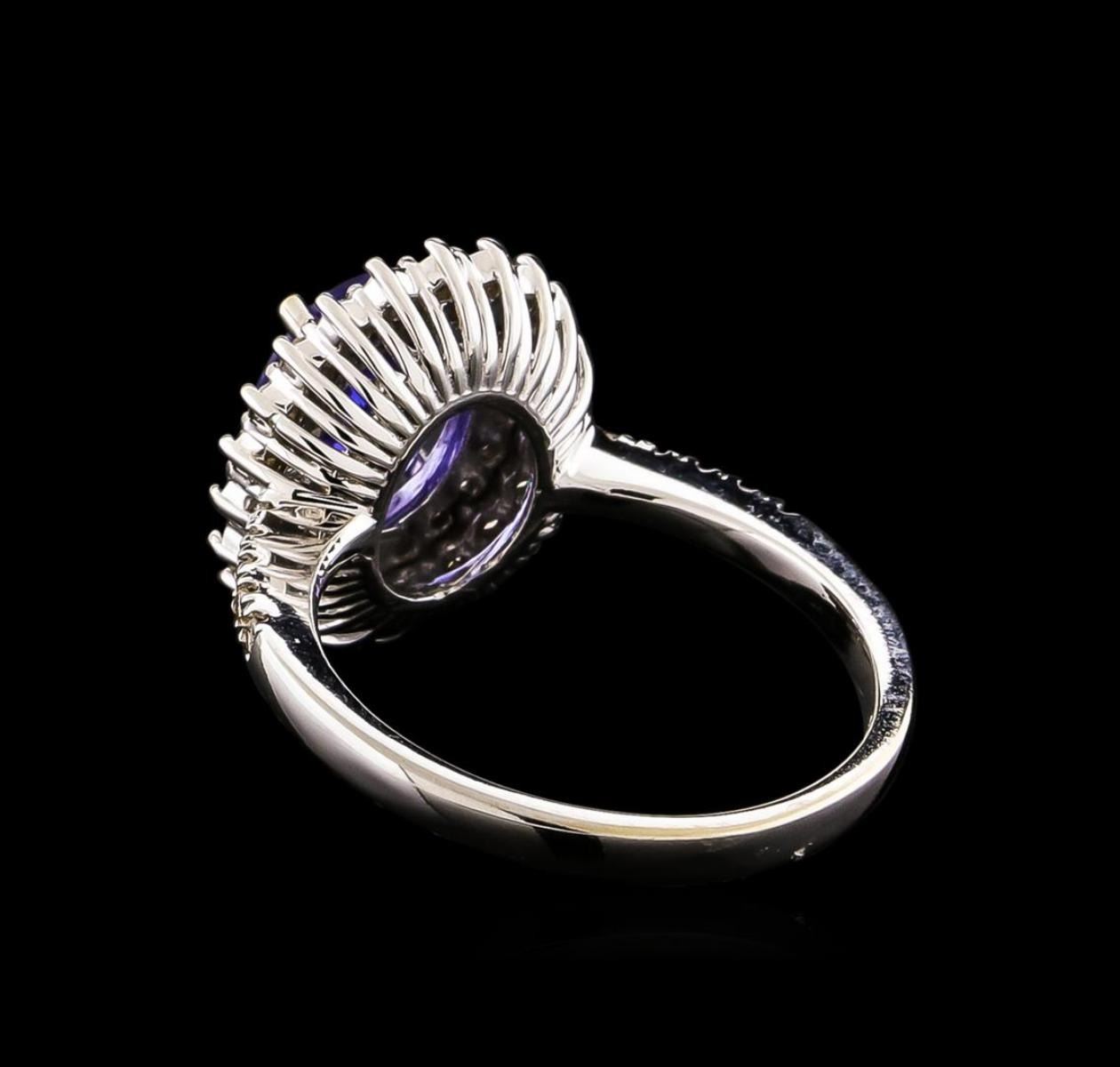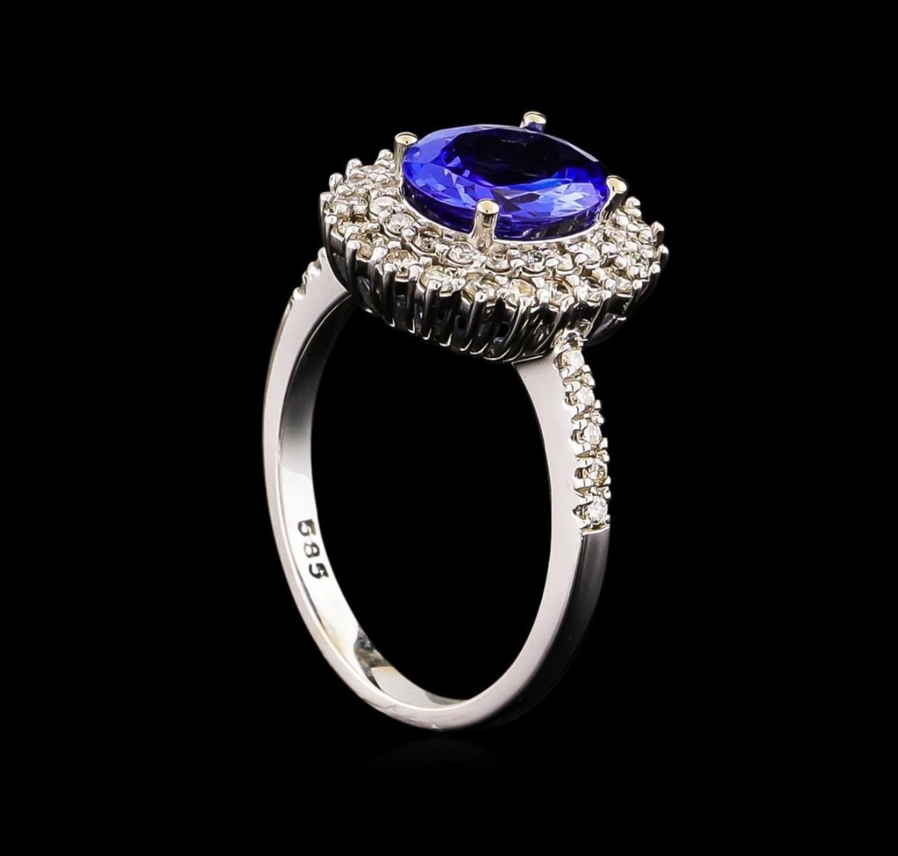 One electronically tested 14KT white gold ladies cast tanzanite and diamond ring with a bright polish finish. Condition is new, good workmanship. The featured tanzanite is set within a two tiered diamond bezel supported by diamond set shoulders, completed by a two millimeter wide band. Identified with markings of "585". Containing: One prong set oval brilliant cut natural tanzanite, measuring 9.35 x 7.10 x 4.00mm, 6%. bulge factor, approximate weight of 1.92ct., clarity is eye clean, type I, medium dark, very slightly grayish, violetish blue color, (GIA vB 6/3), cut is good. Transmitting light with no distortion, transparent. Graded in the setting. Tanzanite is a very rare gemstone that is only found in the country of Tanzania. Originally discovered in 1967. Tiffany & Company, named the stone Tanzanite. It is found in the Usumburu Mountains that border the Umba Valley of northern Tanzania. Tanzanite occurs in gray, brown, violet, blue, reddish-purple, & green. The gem is interesting because of its exceptional pleochroism. Rotated in different directions a tanzanite will exhibit multiple changes of color. Tanzanite has a low tolerance to ultrasonic cleaning, and should not be cleaned using this method. Fifty-Two prong set round brilliant cut diamonds, measuring 1.50 - 1.20 x 0.81mm (depth est.) approximate. Total Weight of 52 Stones = 0.56ct. Graded in the setting. Clarity: VS-2 to SI-2. Color: H - J. Total Weight of Colored Stones 1.92ct. Total Weight of Diamonds 0.56ct. Total Weight of Ring 4.51 grams. AIG Appraised.