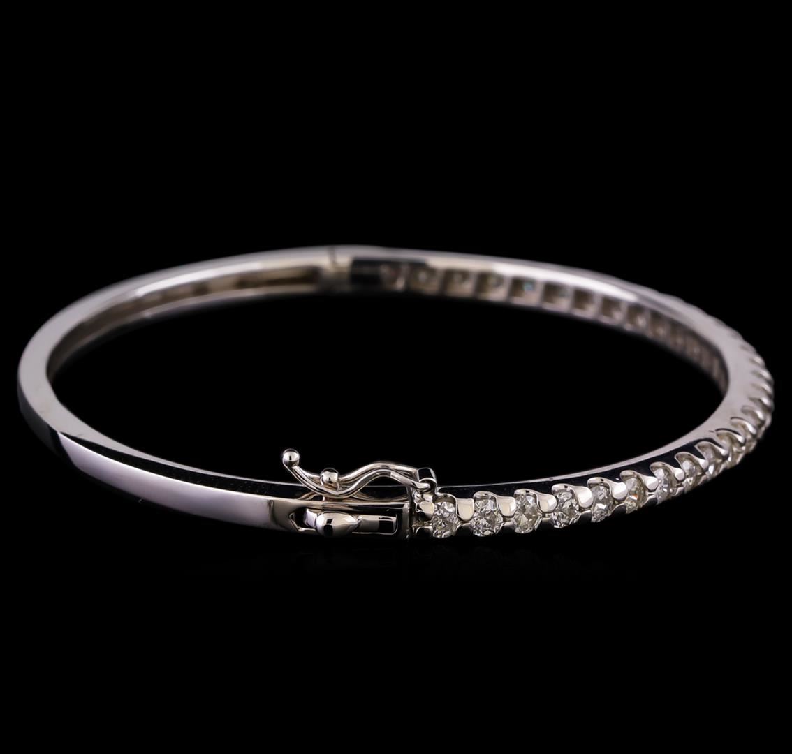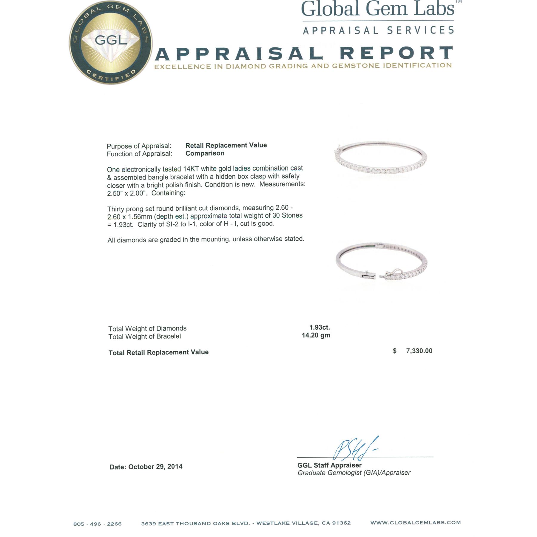 One electronically tested 14KT white gold ladies combination cast & assembled bangle bracelet with a hidden box clasp with safety closer with a bright polish finish. Measurements: 2.50 x 2.00. Condition is new. Containing: Thirty prong set round brilliant cut diamonds, measuring 2.60 - 2.60 x 1.56mm (depth est.) approximate total weight of 30 Stones = 1.93ct. Clarity: SI-2 to I-1. Color: H - I, Cut is Good. All diamonds are graded in the mounting, unless otherwise stated. Total Weight of Diamonds 1.93ct. Total Weight of Bracelet 14.20 grams. GGL Appraised.