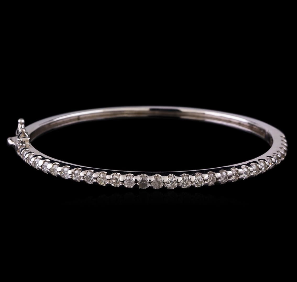 One electronically tested 14KT white gold ladies combination cast & assembled bangle bracelet with a hidden box clasp with safety closer with a bright polish finish. Measurements: 2.50 x 2.00. Condition is new. Containing: Thirty prong set round brilliant cut diamonds, measuring 2.60 - 2.60 x 1.56mm (depth est.) approximate total weight of 30 Stones = 1.93ct. Clarity: SI-2 to I-1. Color: H - I, Cut is Good. All diamonds are graded in the mounting, unless otherwise stated. Total Weight of Diamonds 1.93ct. Total Weight of Bracelet 14.20 grams. GGL Appraised.