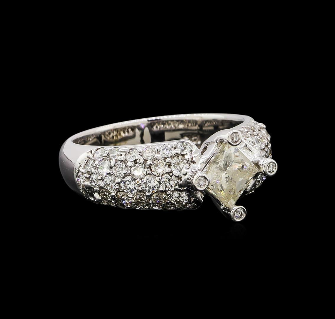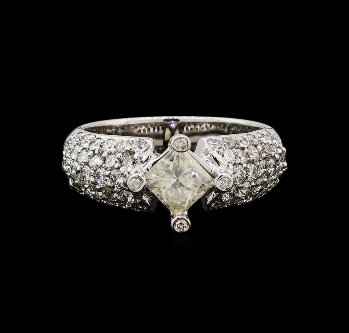 One electronically tested 14KT white gold ladies cast diamond engagement ring. Identified with markings of "14K". Condition is new. Containing: One prong set princess cut diamond, measuring 5.50 x 4.60 x 3.45mm (depth est.) approximate weight of 0.80ct. Clarity: I-2. Color: K, Cut is Good. Four bezel set round brilliant cut diamonds, measuring 1.10 - 1.10 x 0.66mm (depth est.) approximate total weight of 4 Stones = 0.03ct. Clarity: SI-1. Color: I, Cut is Good. Sixty prong set round brilliant cut diamonds, measuring 1.50 - 1.30 x 0.84mm (depth est.) approximate total weight of 60 Stones = 1.10ct. Clarity: SI-1 to SI-2. Color: I, Cut is Good. Diamonds are graded in the mounting, unless otherwise stated. Total Weight of Diamonds 1.93ct. Total Weight of Engagement Ring 6.00 grams. GGL Appraised.