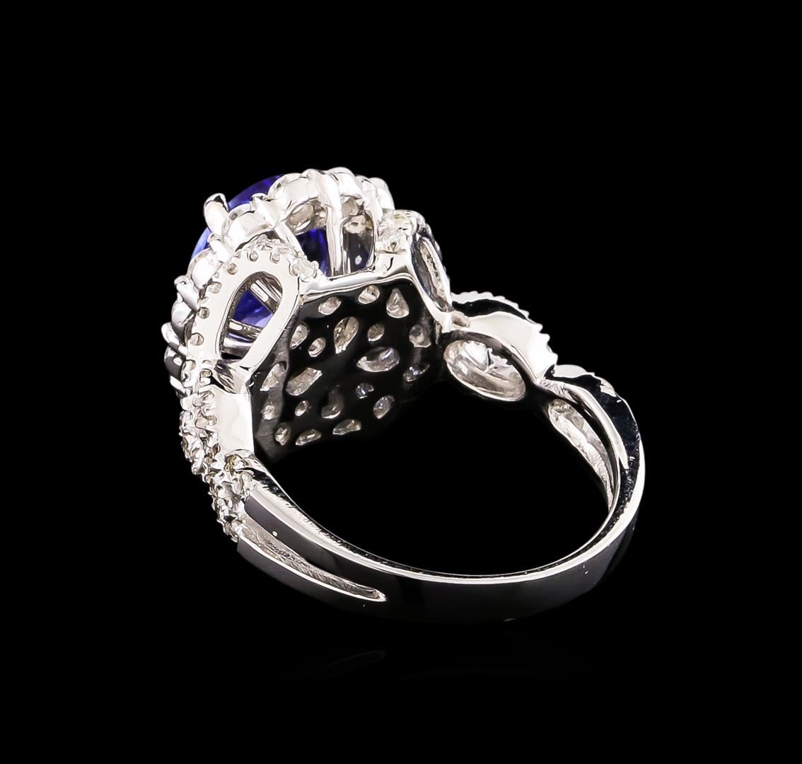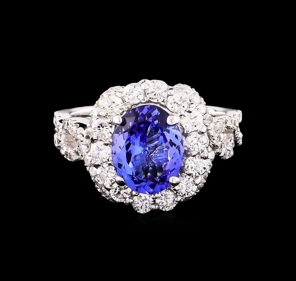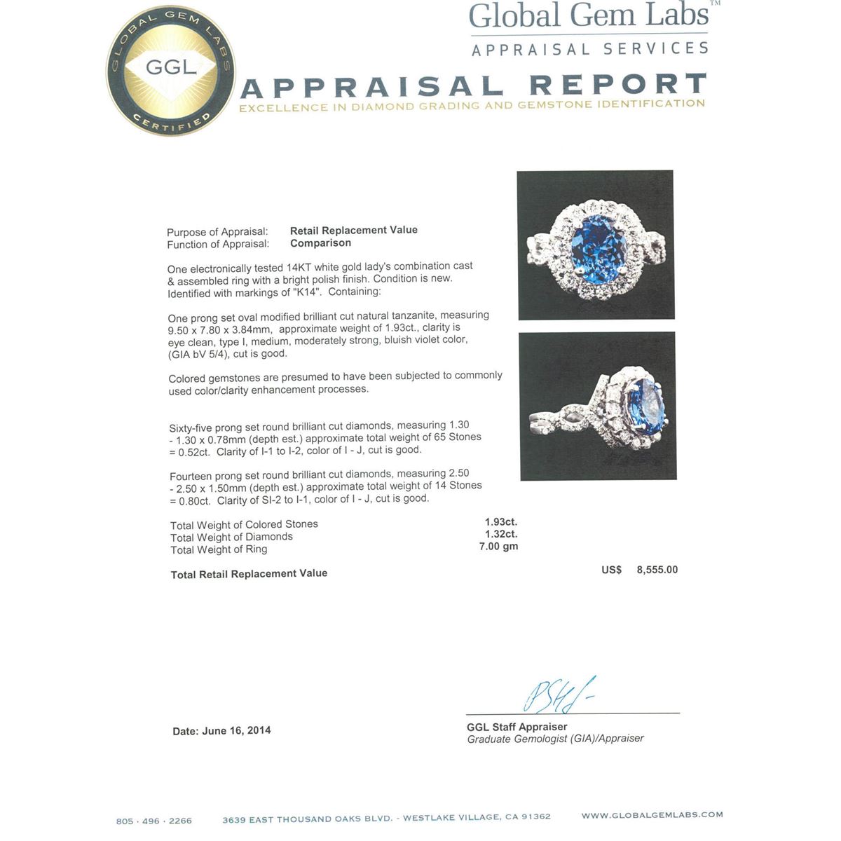 One electronically tested 14KT white gold Ladies combination cast & assembled ring with a bright polish finish. Condition is new. Identified with markings of "K14". Containing: One prong set oval modified brilliant cut natural tanzanite, measuring 9.50 x 7.80 x 3.84mm, approximate weight of 1.93ct., clarity is eye clean, type I, medium, moderately strong, bluish violet color, (GIA bV 5/4), cut is good. Colored gemstones are presumed to have been subjected to commonly used color/clarity enhancement processes. Sixty-Five prong set round brilliant cut diamonds, measuring 1.30 - 1.30 x 0.78mm (depth est.) approximate. Total Weight of 65 Stones = 0.52ct. Clarity: I-1 to I-2. Color: I - J, Cut is Good. Fourteen prong set round brilliant cut diamonds, measuring 2.50 - 2.50 x 1.50mm (depth est.) approximate. Total Weight of 14 Stones = 0.80ct. Clarity: SI-2 to I-1. Color: I - J, Cut is Good. Total Weight of Colored Stones 1.93ct. Total Weight of Diamonds 1.32ct. Total Weight of Ring 7.00 grams. GGL Appraised at $8,555.00.