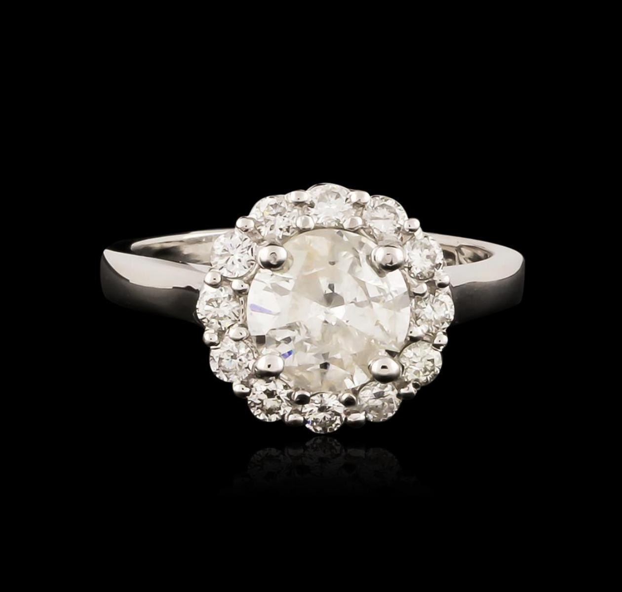 One electronically tested 14KT white gold ladies cast diamond unity ring with a bright polish finish. The featured diamond is set within a diamond bezel, completed by a two millimeter wide band. Identified with markings of "14K". Condition is new, good workmanship. Containing: One prong set round brilliant cut diamond, measuring 7.25 - 7.30 x 4.28mm (depth est.), 6.00.% GTCF approximate weight of 1.47ct with a medium strong blue fluorescence. Naturally occurring internal & external characteristics are present, including natural iridescence. Graded in the setting. Clarity: I-2. Color: I. Depth 58.8%. Table 61.8%. Twelve prong set round brilliant cut diamonds, measuring 2.10 - 2.00 x 1.23mm (depth est.) approximate total weight of 12 Stones = 0.47ct. Graded in the setting. Clarity: SI-1 to SI-2. Color: G - I. Total Weight of Diamonds 1.94ct. Total Weight of Ring 4.45 grams. AIG Appraised.