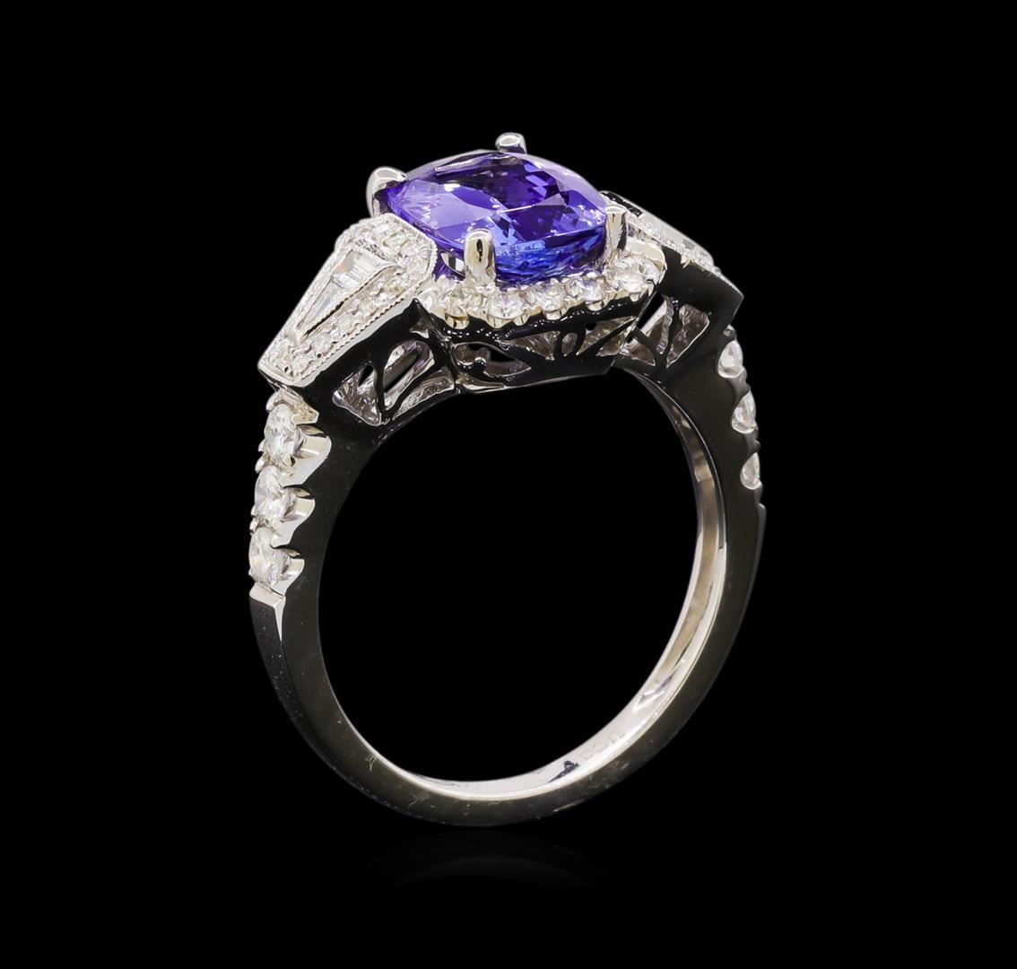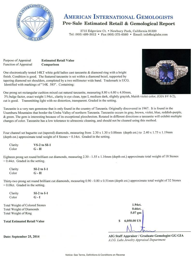 One electronically tested 14KT white gold ladies cast tanzanite & diamond ring with a bright finish. The featured tanzanite is set within a diamond bezel, supported by tapering diamond set shoulders, completed by a two millimeter wide band. Trademark is UCG. Identified with markings of "14K 585". Condition is good. Containing: One prong set rectangular cushion mixed cut natural tanzanite, measuring 8.80 x 6.80 x 4.00mm, 3% bulge factor, exact weight 1.94ct., clarity is eye clean, type I, medium dark, slightly grayish, bluish violet color, (GIA bV 6/2), cut is good. Transmitting light with no distortion, transparent. Graded in the setting. Tanzanite is a very rare gemstone that is only found in the country of Tanzania. Originally discovered in 1967. It is found in the Usumburu Mountains that border the Umba Valley of northern Tanzania. Tanzanite occurs in gray, brown, violet, blue, reddish-purple, & green. The gem is interesting because of its exceptional pleochroism. Rotated in different directions a tanzanite will exhibit multiple changes of color. Tanzanite has a low tolerance to ultrasonic cleaning, and should not be cleaned using this method. Four channel set baguette cut (tapered) diamonds, measuring from 2.30 x 1.30 x 0.88mm (depth est.) to 2.40 x 1.75 x 1.19mm (depth est.) approximate total weight of 4 Stones = 0.14ct. Graded in the setting. Clarity: VS-2 to SI-1. Color: G - H Eighteen prong set round brilliant cut diamonds, measuring 2.30 - 1.55 x 1.16mm (depth est.) approximate total weight of 18 Stones = 0.44ct. Graded in the setting. Clarity: SI-2 to I-1. Color: G - H Thirty-Two prong set round brilliant cut diamonds, measuring 0.90 - 0.80 x 0.51mm (depth est.) approximate total weight of 32 Stones = 0.08ct. Graded in the setting. Clarity: SI-2 to I-1. Color: G - I. Total Weight of Colored Stones 1.94ct. Total Weight of Diamonds 0.66ct. Total Weight of Ring 5.07 grams. AIG Appraised.