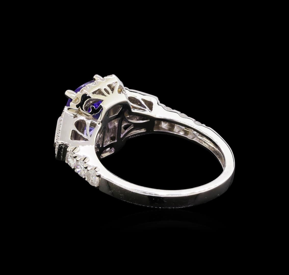 One electronically tested 14KT white gold ladies cast tanzanite & diamond ring with a bright finish. The featured tanzanite is set within a diamond bezel, supported by tapering diamond set shoulders, completed by a two millimeter wide band. Trademark is UCG. Identified with markings of "14K 585". Condition is good. Containing: One prong set rectangular cushion mixed cut natural tanzanite, measuring 8.80 x 6.80 x 4.00mm, 3% bulge factor, exact weight 1.94ct., clarity is eye clean, type I, medium dark, slightly grayish, bluish violet color, (GIA bV 6/2), cut is good. Transmitting light with no distortion, transparent. Graded in the setting. Tanzanite is a very rare gemstone that is only found in the country of Tanzania. Originally discovered in 1967. It is found in the Usumburu Mountains that border the Umba Valley of northern Tanzania. Tanzanite occurs in gray, brown, violet, blue, reddish-purple, & green. The gem is interesting because of its exceptional pleochroism. Rotated in different directions a tanzanite will exhibit multiple changes of color. Tanzanite has a low tolerance to ultrasonic cleaning, and should not be cleaned using this method. Four channel set baguette cut (tapered) diamonds, measuring from 2.30 x 1.30 x 0.88mm (depth est.) to 2.40 x 1.75 x 1.19mm (depth est.) approximate total weight of 4 Stones = 0.14ct. Graded in the setting. Clarity: VS-2 to SI-1. Color: G - H Eighteen prong set round brilliant cut diamonds, measuring 2.30 - 1.55 x 1.16mm (depth est.) approximate total weight of 18 Stones = 0.44ct. Graded in the setting. Clarity: SI-2 to I-1. Color: G - H Thirty-Two prong set round brilliant cut diamonds, measuring 0.90 - 0.80 x 0.51mm (depth est.) approximate total weight of 32 Stones = 0.08ct. Graded in the setting. Clarity: SI-2 to I-1. Color: G - I. Total Weight of Colored Stones 1.94ct. Total Weight of Diamonds 0.66ct. Total Weight of Ring 5.07 grams. AIG Appraised.