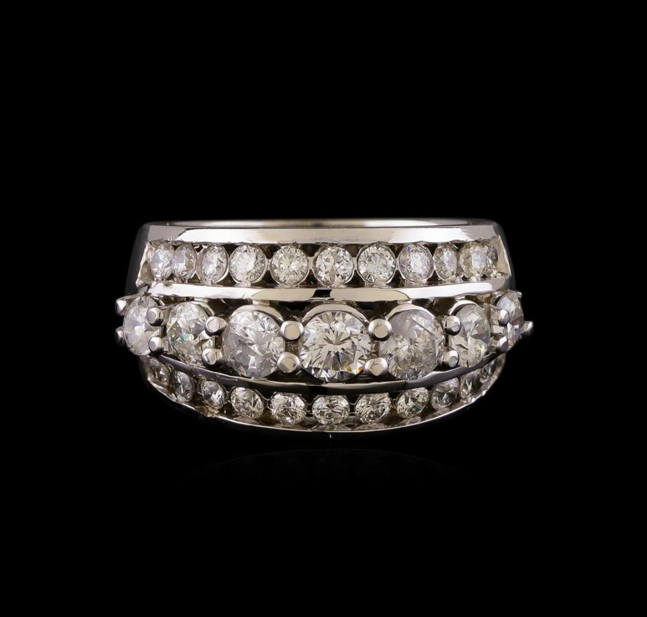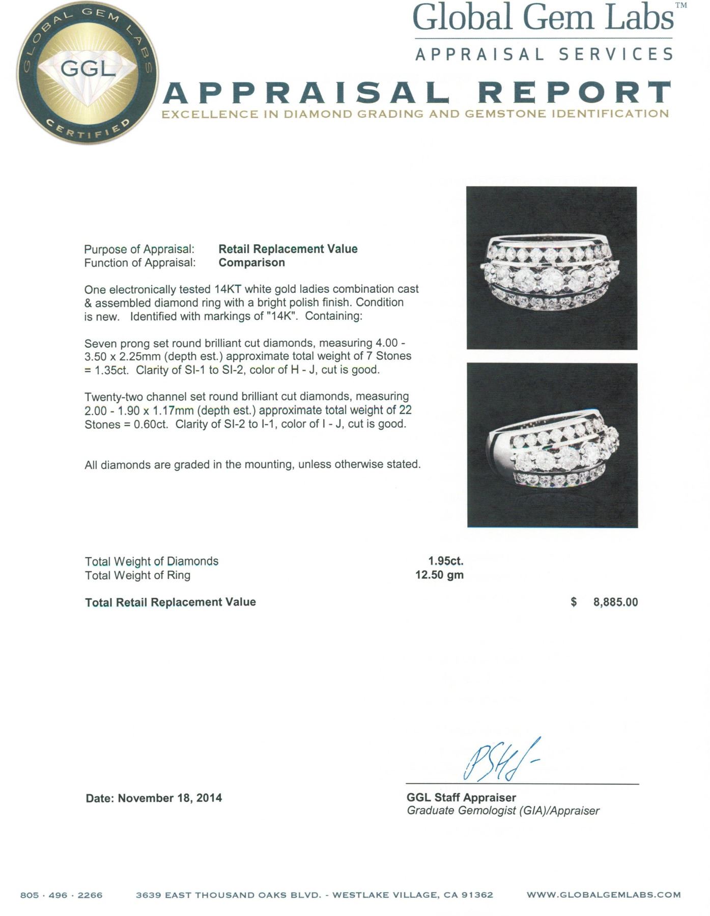 One electronically tested 14KT white gold ladies combination cast & assembled diamond ring with a bright polish finish. Identified with markings of "14K". Condition is new. Containing: Seven prong set round brilliant cut diamonds, measuring 4.00 - 3.50 x 2.25mm (depth est.) approximate total weight of 7 Stones = 1.35ct. Clarity: SI-1 to SI-2. Color: H - J, Cut is Good. Twenty-Two channel set round brilliant cut diamonds, measuring 2.00 - 1.90 x 1.17mm (depth est.) approximate total weight of 22 Stones = 0.60 ct. Clarity: SI-2 to I-1. Color: I - J, Cut is Good. All diamonds are graded in the mounting, unless otherwise stated. Total Weight of Diamonds 1.95ct. Total Weight of Ring 12.50 grams. GGL Appraised.