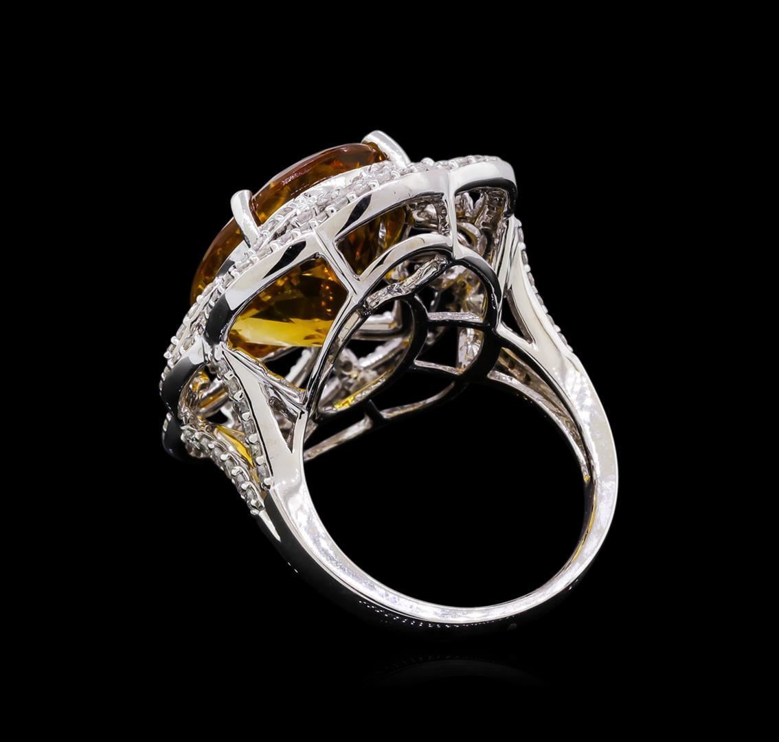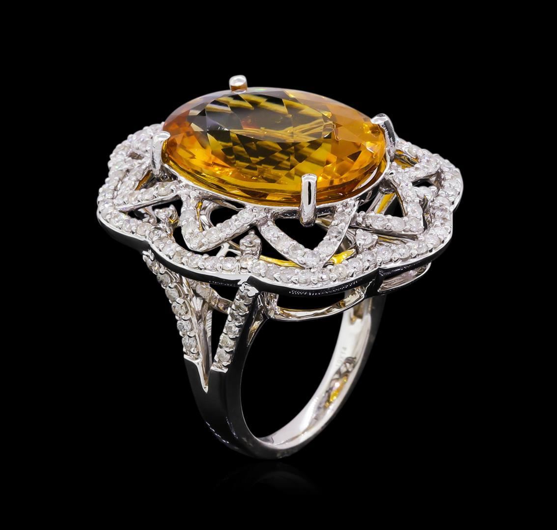 One electronically tested 14KT white gold Ladies combination cast & assembled cocktail ring with a bright polish finish. Identified with markings of "14K". Condition is excellent. Containing: One prong set oval modified brilliant cut natural citrine quartz, measuring 18.20 x 13.00 x 8.40mm, approximate weight of 10.91ct., clarity is eye clean, type I, medium light, moderately strong, orangy yellow color, (GIA oY 4/4), cut is good. Colored gemstones are presumed to have been subjected to commonly used and possible undetectable color/clarity enhancement processes. One Hundred Forty-Six prong set round brilliant cut diamonds, measuring 1.30 - 1.30 x 0.78mm (depth est.) approximate total weight of 146 Stones = 1.32ct. Clarity of I-2 to I-3, Color of I - J. Total Weight of Colored Stones 10.91ct. Total Weight of Diamonds 1.32ct. Total Weight of Ring 10.80gm. GGL Appraised.