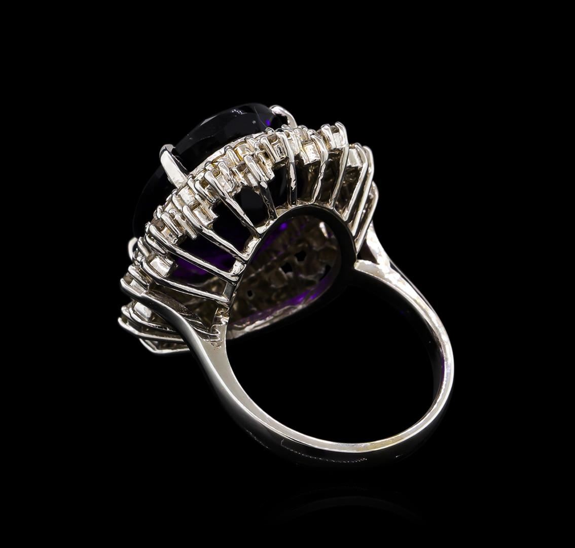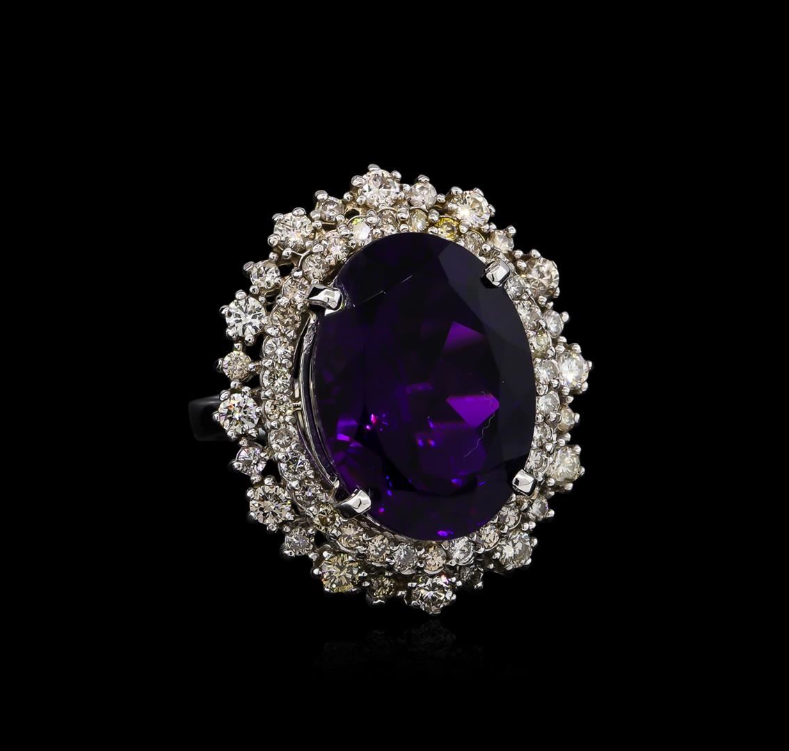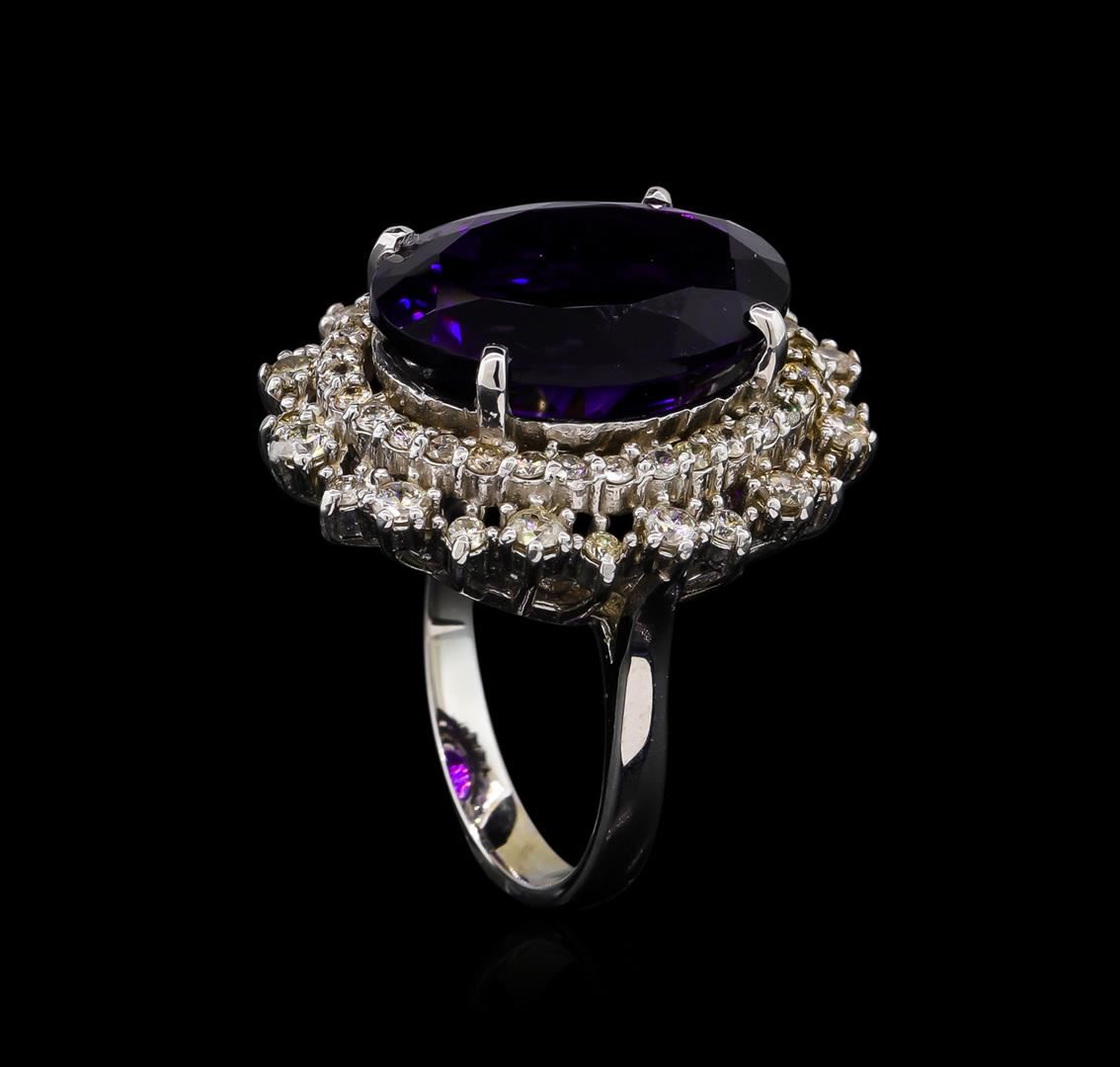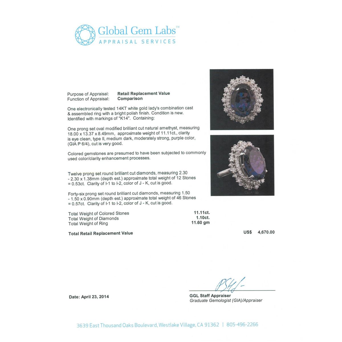 One electronically tested 14KT white gold Ladies combination cast & assembled ring with a bright polish finish. Condition is new. Identified with markings of "K14". Containing: One prong set oval modified brilliant cut natural amethyst, measuring 18.00 x 13.37 x 8.49mm, approximate weight of 11.11ct., clarity is eye clean, type II, medium dark, moderately strong, purple color, (GIA P 6/4), cut is very good. Colored gemstones are presumed to have been subjected to commonly used color/clarity enhancement processes. Twelve prong set round brilliant cut diamonds, measuring 2.30 - 2.30 x 1.38mm (depth est.) approximate. Total Weight of 12 Stones = 0.53ct. Clarity: I-1 to I-2. Color: J - K, Cut is Good. Forty-Six prong set round brilliant cut diamonds, measuring 1.50 - 1.50 x 0.90mm (depth est.) approximate. Total Weight of 46 Stones = 0.57ct. Clarity: I-1 to I-2. Color: J - K, Cut is Good. Total Weight of Colored Stones 11.11ct. Total Weight of Diamonds 1.10ct. Total Weight of Ring 11.60 grams. GGL Appraised at $4,670.00.