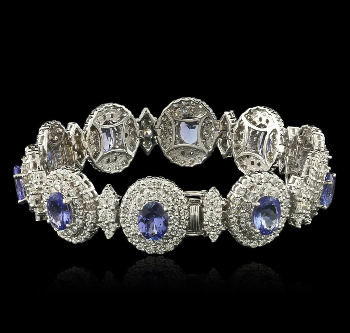 One electronically tested 14KT white gold ladies cast tanzanite and diamond bracelet with a hidden box clasp with safety closer with a bright polish finish. Measurements: 7" in length Identified with markings of "14K". Condition is new. Containing: Ten prong set oval modified brilliant cut natural tanzanites, measuring 7.90 x 5.90 x 3.84mm, approximate total weight of 11.11ct., clarity is eye clean, type I, medium light, very slightly grayish, violet color, (GIA V 4/3), cut is good. Ten prong set round brilliant cut diamonds, measuring 3.00 - 3.00 x 1.80mm (depth est.) approximate total weight of 10 Stones = 1.27ct. Clarity: SI-1 to SI-2. Color: H - I, Cut is Good. Four Hundred prong set round brilliant cut diamonds, measuring 1.90 - 1.90 x 1.14mm (depth est.) approximate total weight of 400 Stones = 8.95ct. Clarity: SI-1 to I-1. Color: H - I, Cut is Good. Colored gemstones are presumed to have been subjected to commonly used enhancement processes. All diamonds and colored gemstones are graded in the mounting, unless otherwise stated. Total Weight of Colored Stones 11.11ct. Total Weight of Diamonds 10.22ct. Total Weight of Bracelet 35.80 grams. GGL Appraised.