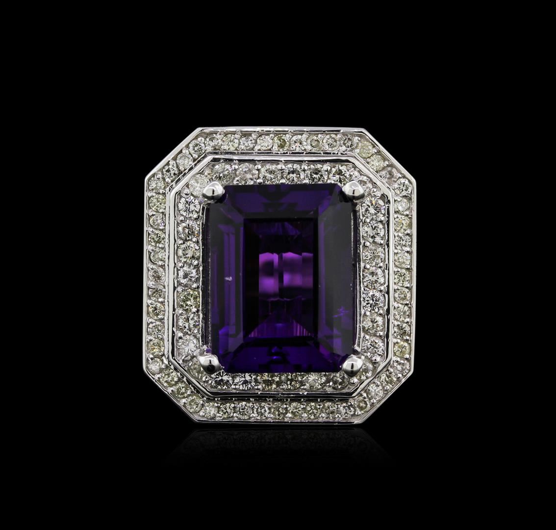 One electronically tested 14KT white gold ladies cast amethyst and diamond ring with a bright polish finish. Identified with markings of "14K". Condition is new. Containing: One prong set emerald standard step cut natural amethyst, measuring 16.00 x 12.00 x 8.08mm, approximate weight of 11.14ct., clarity is eye clean, type II, medium, moderately strong, purple color, (GIA P 5/4), cut is good. Eighty prong set round brilliant cut diamonds, measuring 2.00 - 2.00 x 1.20mm (depth est.) approximate total weight of 80 Stones = 2.34ct. Clarity: SI-2 to I-2. Color: I - K, Cut is Good. All diamonds and colored gemstones are graded in the mounting, unless otherwise stated. Colored gemstones are presumed to have been subjected to commonly used enhancement processes. Total Weight of Colored Stones 11.14ct. Total Weight of Diamonds 2.34ct. Total Weight of Ring 19.60 grams. GGL Appraised.