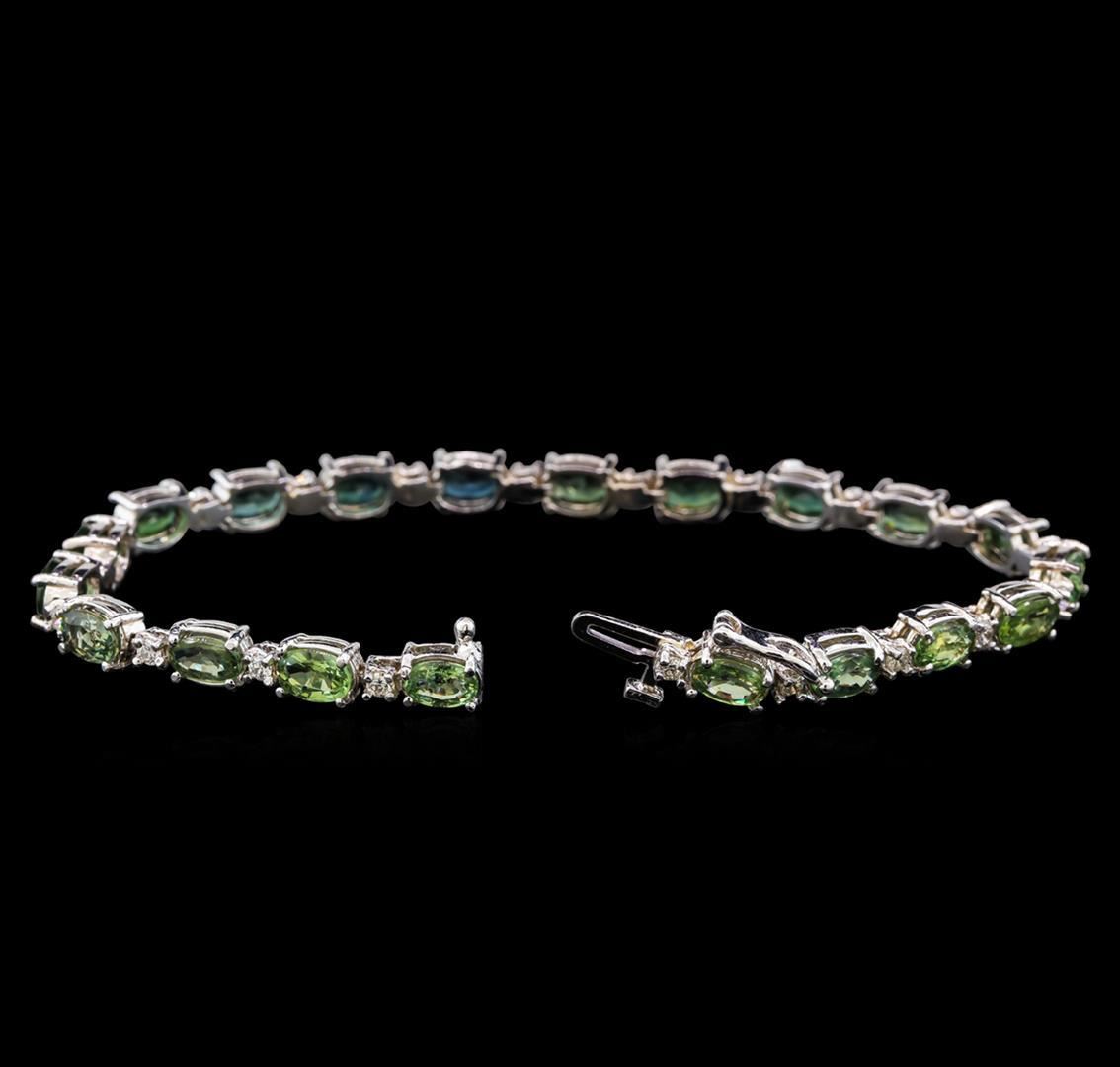 One electronically tested 14KT white gold ladies cast sapphire and diamond bracelet with a hidden box clasp with safety closer with a bright polish finish. Measurements: 7" in length Identified with markings of "14K". Condition is new. Containing: Twenty prong set oval modified brilliant cut natural green sapphires, measuring 7.10 x 3.80 x 2.47mm, approximate total weight of 11.20ct., clarity is moderately included, medium light, very slightly grayish, green color, (GIA G 4/3), cut is good. Twenty prong set round brilliant cut diamonds, measuring 2.00 - 2.00 x 1.20mm (depth est.) approximate total weight of 20 Stones = 0.58ct. Clarity: SI-1 to SI-2. Color: J - K, Cut is Good. Colored gemstones are presumed to have been subjected to commonly used enhancement processes. All diamonds and colored gemstones are graded in the mounting, unless otherwise stated. Total Weight of Colored Stones 11.20ct. Total Weight of Diamonds 0.58ct. Total Weight of Bracelet 12.00 grams. GGL Appraised.
