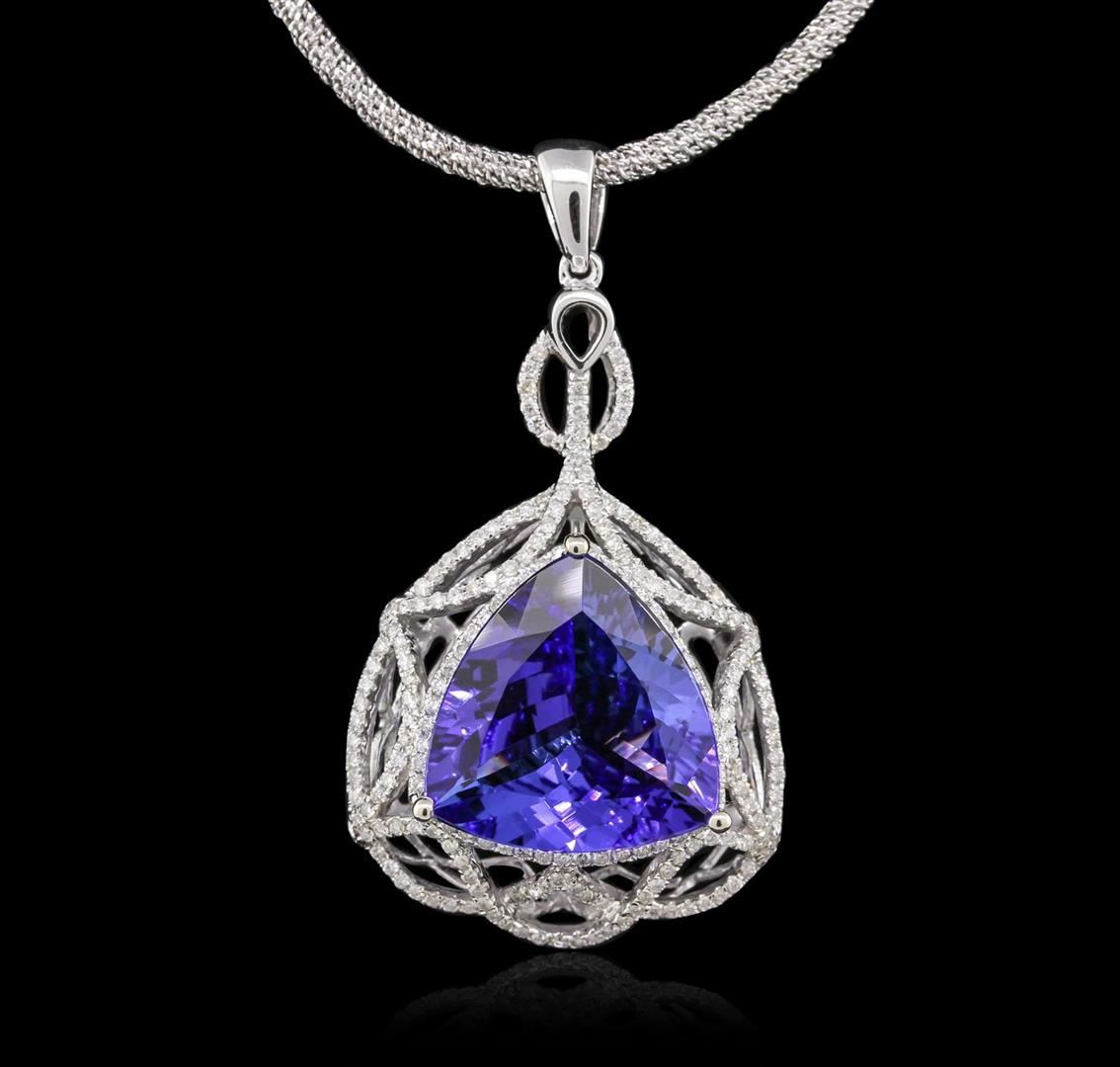 One electronically tested 14KT white gold Ladies combination cast & assembled pendant & chain 17.5" long, medium fancy cable link with a lobster claw clasp with a high polish finish. Condition is new. Identified with markings of "14K". Containing: One Hundred Ninety-Seven prong set round brilliant cut diamonds, measuring 0.90 - 0.90 x 0.54mm (depth est.) approximate. Total Weight of 197 Stones = 0.85ct. Clarity: I-1 to I-2. Color: H - I, Cut is Good. One prong set triangle modified brilliant cut natural tanzanite, measuring 16.50 x 16.12 x 7.23mm, exact weight 11.31ct., clarity is eye clean, type I, medium light, moderately strong, violet color, (GIA V 4/4), cut is very good. GIA Report: 1156964661.Total Weight of Colored Stones 11.31ct. Total Weight of Diamonds 0.85ct. Total Weight of Pendant & Chain 19.50 grams. GGL Appraised.