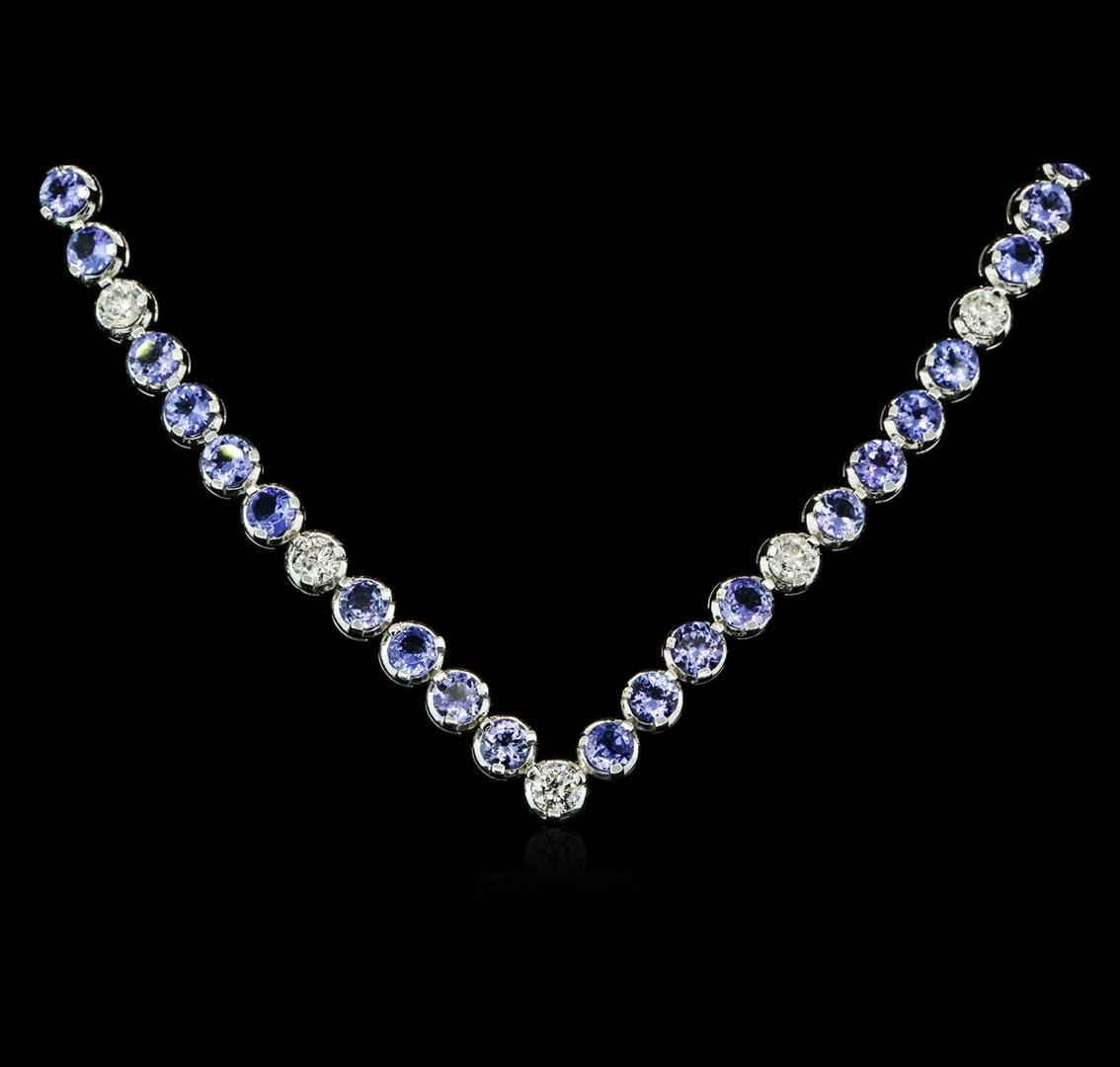 One electronically tested 14KT white gold ladies combination cast & assembled tanzanite and diamond necklace with a hidden box clasp with safety closer with a bright polish finish. Identified with markings of "14K". Condition is new. Containing: Twenty-four prong set round modified brilliant cut natural tanzanites, measuring 5.17 - 4.80 x 2.66 mm, approximate total weight of 11.52ct., clarity is eye clean, type I, medium light, very slightly grayish, violet color, (GIA V 4/3), cut is good. Five prong set round brilliant cut diamonds, measuring 4.79 - 4.30 x 2.95mm (depth est.) approximate total weight of 5 Stones = 1.86ct. Clarity: SI-2 to I-1. Color: I - J, Cut is Good. All diamonds and colored gemstones are graded in the mounting, unless otherwise stated. Colored gemstones are presumed to have been subjected to commonly used enhancement processes. Sixty-Six prong set round brilliant cut diamonds, measuring 2.00 - 2.00 x 1.20mm (depth est.) approximate total weight of 66 Stones = 1.93ct. Clarity: SI-2. Color: I - J, Cut is Good. All diamonds and colored gemstones are graded in the mounting, unless otherwise stated. Colored gemstones are presumed to have been subjected to commonly used enhancement processes. Total Weight of Colored Stones 11.52ct. Total Weight of Diamonds 3.79ct. Total Weight of Necklace 37.50 grams. GGL Appraised at $18,980.00.
