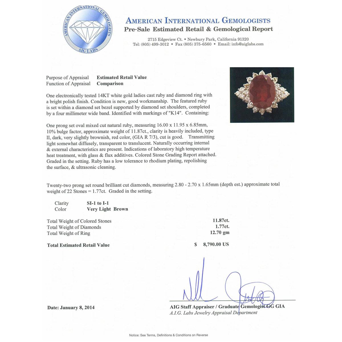 One electronically tested 14KT white gold ladies cast ruby and diamond ring with a bright polish finish. The featured ruby is set within a diamond set bezel supported by diamond set shoulders, completed by a four millimeter wide band. Identified with markings of "K14". Condition is new, good workmanship. Containing: One prong set oval mixed cut natural ruby, measuring 16.00 x 11.95 x 6.85mm, 10%. bulge factor, approximate weight of 11.87ct., clarity is heavily included, type II, dark, very slightly brownish, red color, (GIA R 7/3), cut is good. Transmitting light somewhat diffusely, transparent to translucent. Naturally occurring internal & external characteristics are present. Indications of laboratory high temperature heat treatment, with glass & flux additives. Colored Stone Grading Report attached. Graded in the setting. Ruby has a low tolerance to rhodium plating, repolishing the surface, & ultrasonic cleaning. Twenty-Two prong set round brilliant cut diamonds, measuring 2.80 - 2.70 x 1.65mm (depth est.) approximate. Total Weight of 22 Stones = 1.77ct. Graded in the setting. Clarity: SI-1 to I-1 . Total Weight of Colored Stones 11.87ct. Total Weight of Diamonds 1.77ct. AIG Appraised at $8,790.00.