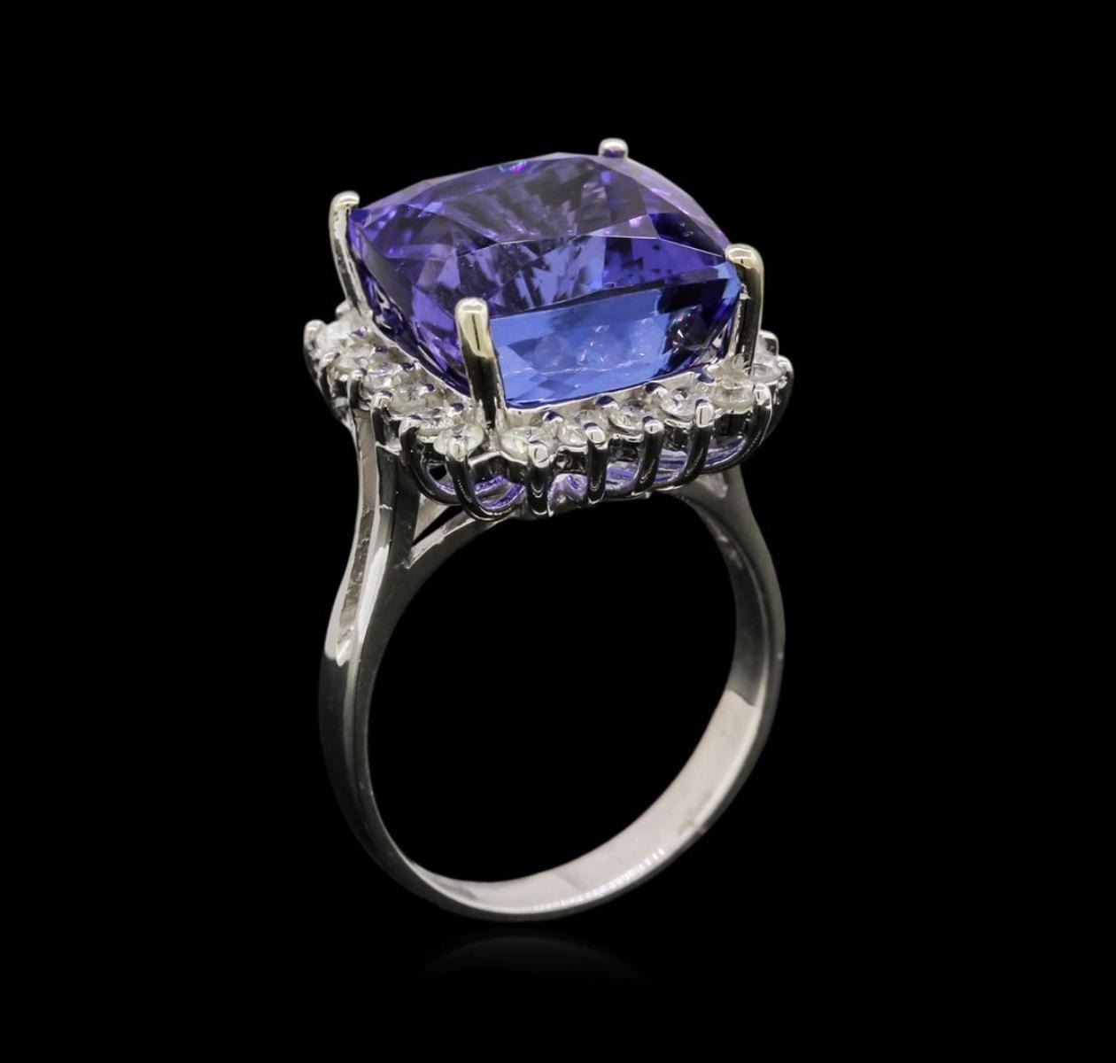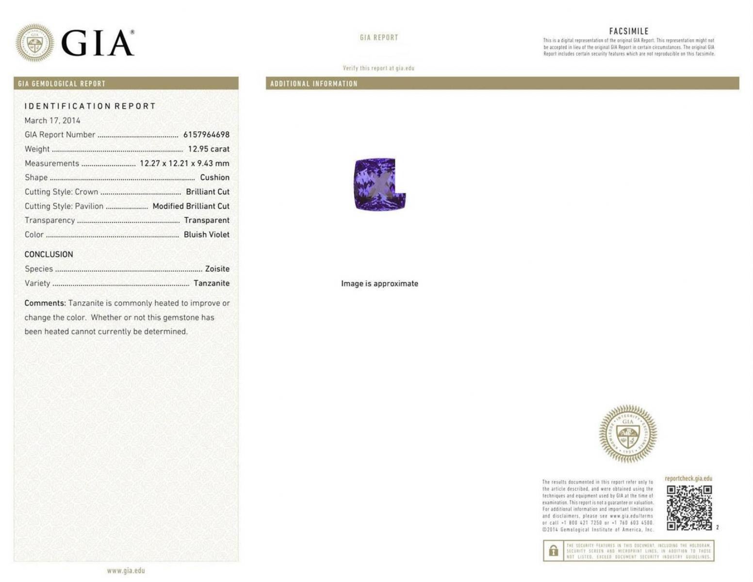 One electronically tested 14KT white gold Ladies combination cast & assembled fancy ring with a high polish finish. Condition is new. Identified with markings of "14K". Containing: Twenty-Two prong set round brilliant cut diamonds, measuring 2.00 - 2.00 x 1.20mm (depth est.) approximate. Total Weight of 22 Stones = 0.63ct. Clarity: I-1 to I-2. Color: I - J, Cut is Good. One prong set square cushion modified brilliant cut natural tanzanite, measuring 12.27 x 12.21 x 9.43mm, exact weight 12.95ct., clarity is eye clean, type I, medium, moderately strong, bluish violet color, (GIA bV 5/4), cut is very good. GIA Report: 6157964698.Total Weight of Colored Stones 12.95ct. Total Weight of Diamonds 0.63ct. Total Weight of Ring 6.70 grams. GGL Appraised.