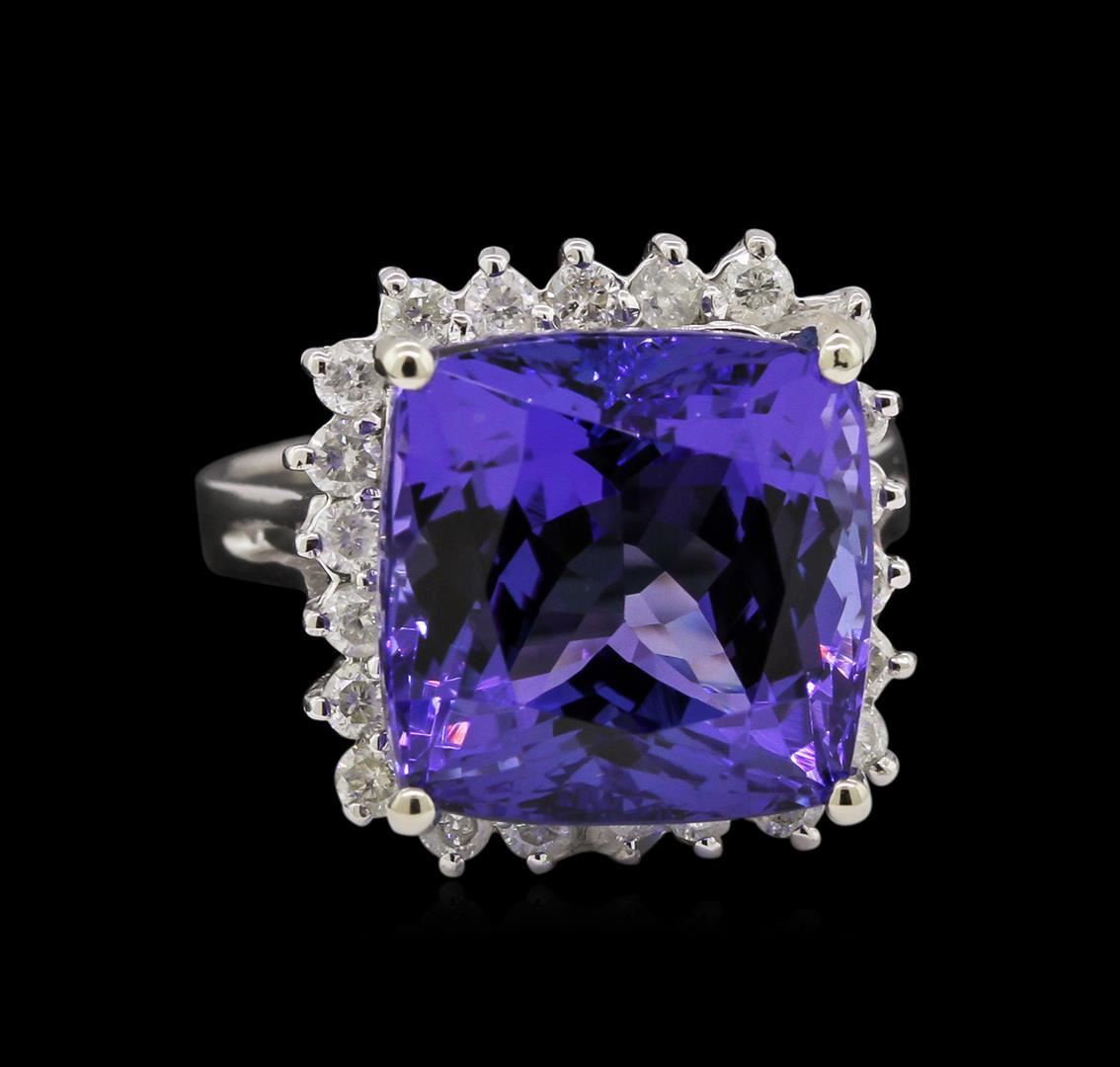 One electronically tested 14KT white gold Ladies combination cast & assembled fancy ring with a high polish finish. Condition is new. Identified with markings of "14K". Containing: Twenty-Two prong set round brilliant cut diamonds, measuring 2.00 - 2.00 x 1.20mm (depth est.) approximate. Total Weight of 22 Stones = 0.63ct. Clarity: I-1 to I-2. Color: I - J, Cut is Good. One prong set square cushion modified brilliant cut natural tanzanite, measuring 12.27 x 12.21 x 9.43mm, exact weight 12.95ct., clarity is eye clean, type I, medium, moderately strong, bluish violet color, (GIA bV 5/4), cut is very good. GIA Report: 6157964698.Total Weight of Colored Stones 12.95ct. Total Weight of Diamonds 0.63ct. Total Weight of Ring 6.70 grams. GGL Appraised.