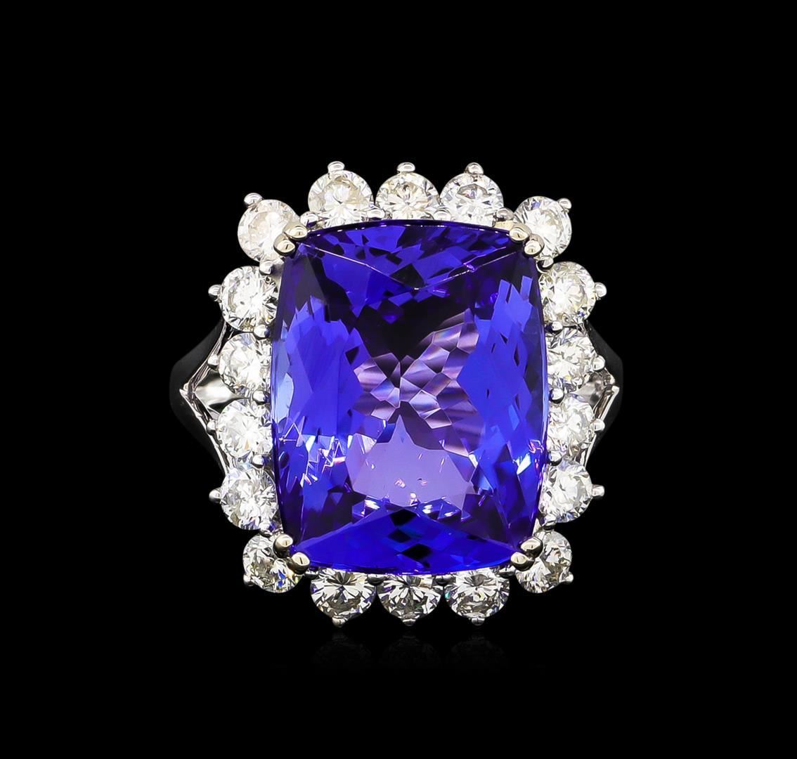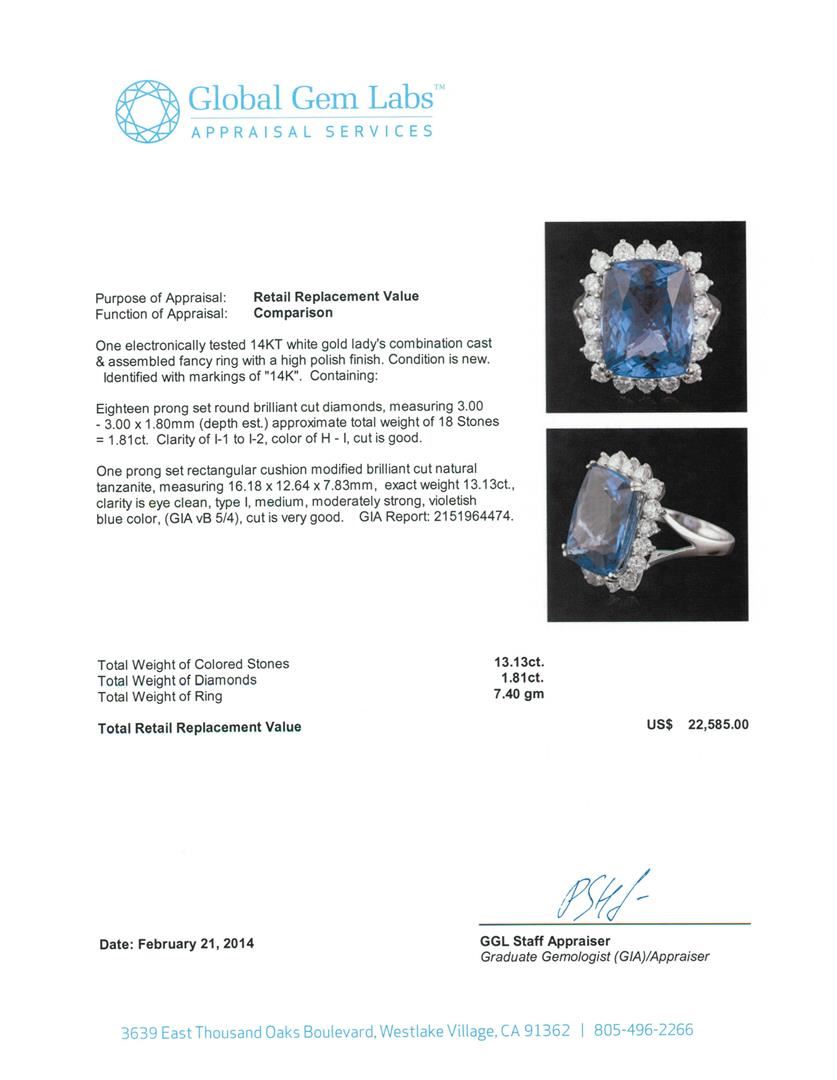 One electronically tested 14KT white gold Ladies combination cast & assembled fancy ring with a high polish finish. Identified with markings of "14K". Condition is new. Containing: Eighteen prong set round brilliant cut diamonds, measuring 3.00 - 3.00 x 1.80mm (depth est.) approximate. Total Weight of 18 Stones = 1.81ct. Clarity: I-1 to I-2. Color: H - I, Cut is Good. One prong set rectangular cushion modified brilliant cut natural tanzanite, measuring 16.18 x 12.64 x 7.83mm, exact weight 13.13ct., clarity is eye clean, type I, medium, moderately strong, violetish blue color, (GIA vB 5/4), cut is very good. GIA Report: 2151964474.Total Weight of Colored Stones 13.13ct. Total Weight of Diamonds 1.81ct. Total Weight of Ring 7.40gm. GGL Appraised.