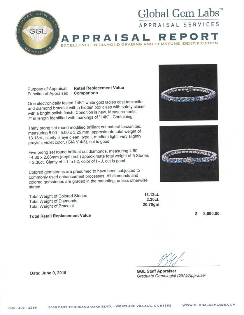 One electronically tested 14KT white gold ladies cast tanzanite and diamond bracelet with a hidden box clasp with safety closer with a bright polish finish. Measurements: 7" in length Identified with markings of "14K". Condition is new. Containing: Thirty prong set round modified brilliant cut natural tanzanites, measuring 5.00 - 5.00 x 3.25 mm, approximate total weight of 13.13ct., clarity is eye clean, type I, medium light, very slightly grayish, violet color, (GIA V 4/3), cut is good. Five prong set round brilliant cut diamonds, measuring 4.80 - 4.80 x 2.88mm (depth est.) approximate total weight of 5 Stones = 2.30ct. Clarity: I-1 to I-2. Color: I - J, Cut is Good. Colored gemstones are presumed to have been subjected to commonly used enhancement processes. All diamonds and colored gemstones are graded in the mounting, unless otherwise stated. Total Weight of Colored Stones 13.13ct. Total Weight of Diamonds 2.30ct. Total Weight of Bracelet 20.70 grams. GGL Appraised at $8,690.00.