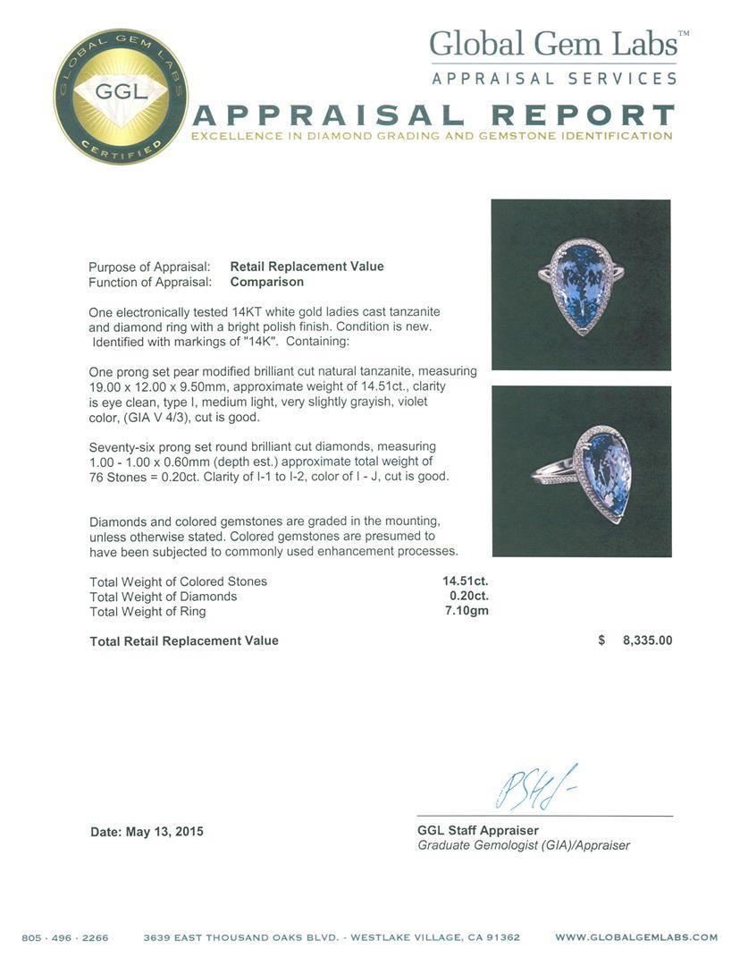 One electronically tested 14KT white gold ladies cast tanzanite and diamond ring with a bright polish finish. Identified with markings of "14K". Condition is new. Containing: One prong set pear modified brilliant cut natural tanzanite, measuring 19.00 x 12.00 x 9.50mm, approximate weight of 14.51ct., clarity is eye clean, type I, medium light, very slightly grayish, violet color, (GIA V 4/3), cut is good. Seventy-Six prong set round brilliant cut diamonds, measuring 1.00 - 1.00 x 0.60mm (depth est.) approximate total weight of 76 Stones = 0.20ct. Clarity: I-1 to I-2. Color: I - J, Cut is Good. Diamonds and colored gemstones are graded in the mounting, unless otherwise stated. Colored gemstones are presumed to have been subjected to commonly used enhancement processes.. Total Weight of Colored Stones 14.51ct. Total Weight of Diamonds 0.20ct. Total Weight of Ring 7.10 grams. GGL Appraised.