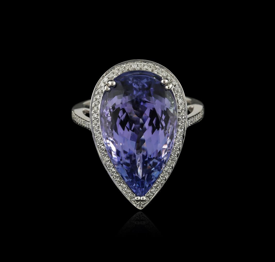 One electronically tested 14KT white gold ladies cast tanzanite and diamond ring with a bright polish finish. Identified with markings of "14K". Condition is new. Containing: One prong set pear modified brilliant cut natural tanzanite, measuring 19.00 x 12.00 x 9.50mm, approximate weight of 14.51ct., clarity is eye clean, type I, medium light, very slightly grayish, violet color, (GIA V 4/3), cut is good. Seventy-Six prong set round brilliant cut diamonds, measuring 1.00 - 1.00 x 0.60mm (depth est.) approximate total weight of 76 Stones = 0.20 ct. Clarity: I-1 to I-2. Color: I - J, Cut is Good. Diamonds and colored gemstones are graded in the mounting, unless otherwise stated. Colored gemstones are presumed to have been subjected to commonly used enhancement processes.. Total Weight of Colored Stones 14.51ct. Total Weight of Diamonds 0.20 ct. Total Weight of Ring 7.10 grams. GGL Appraised.