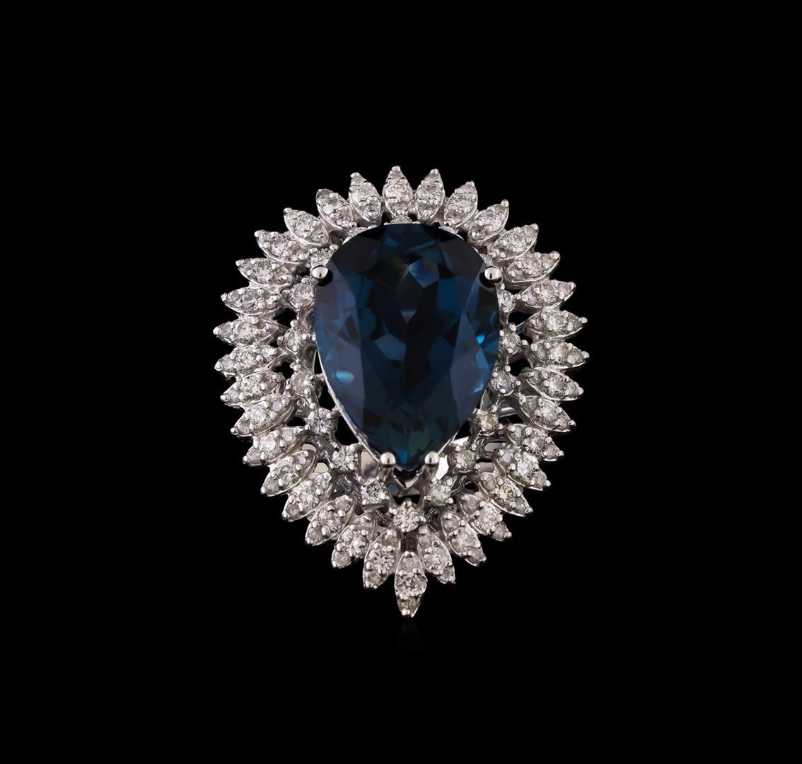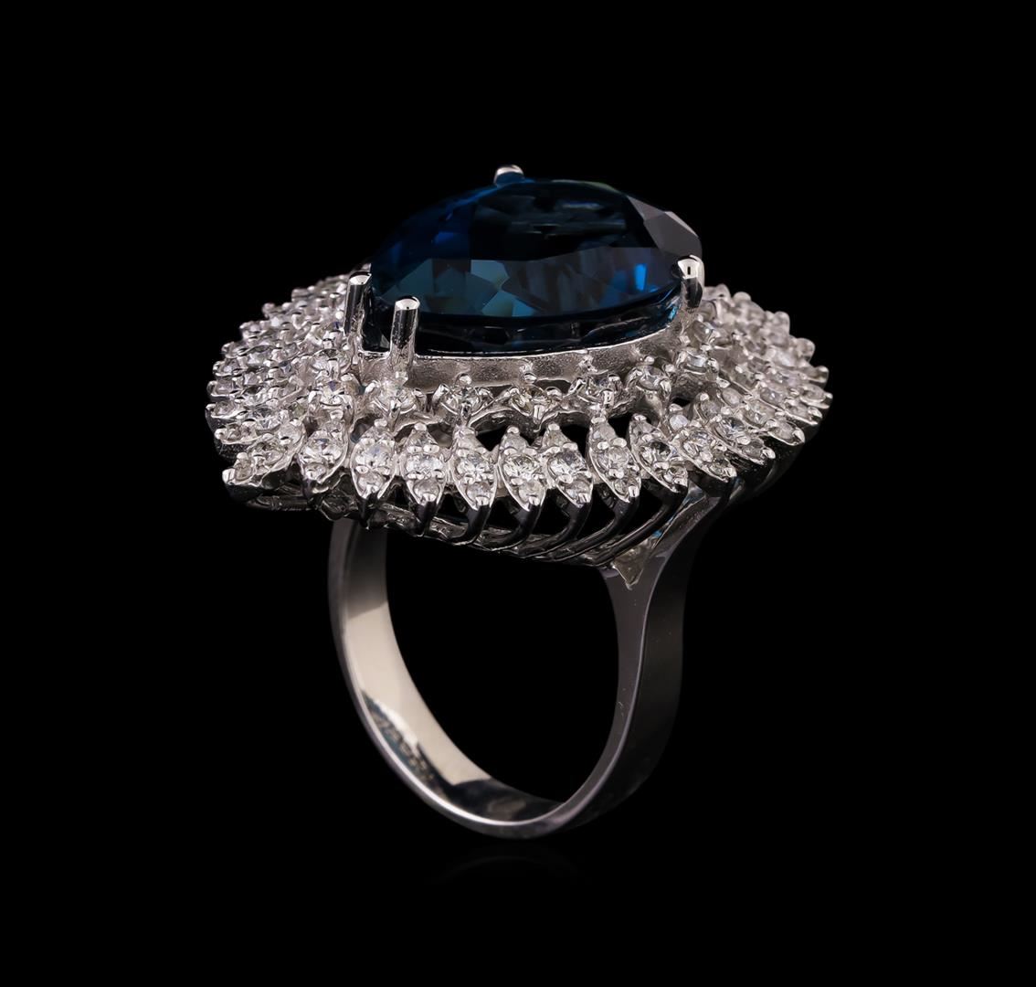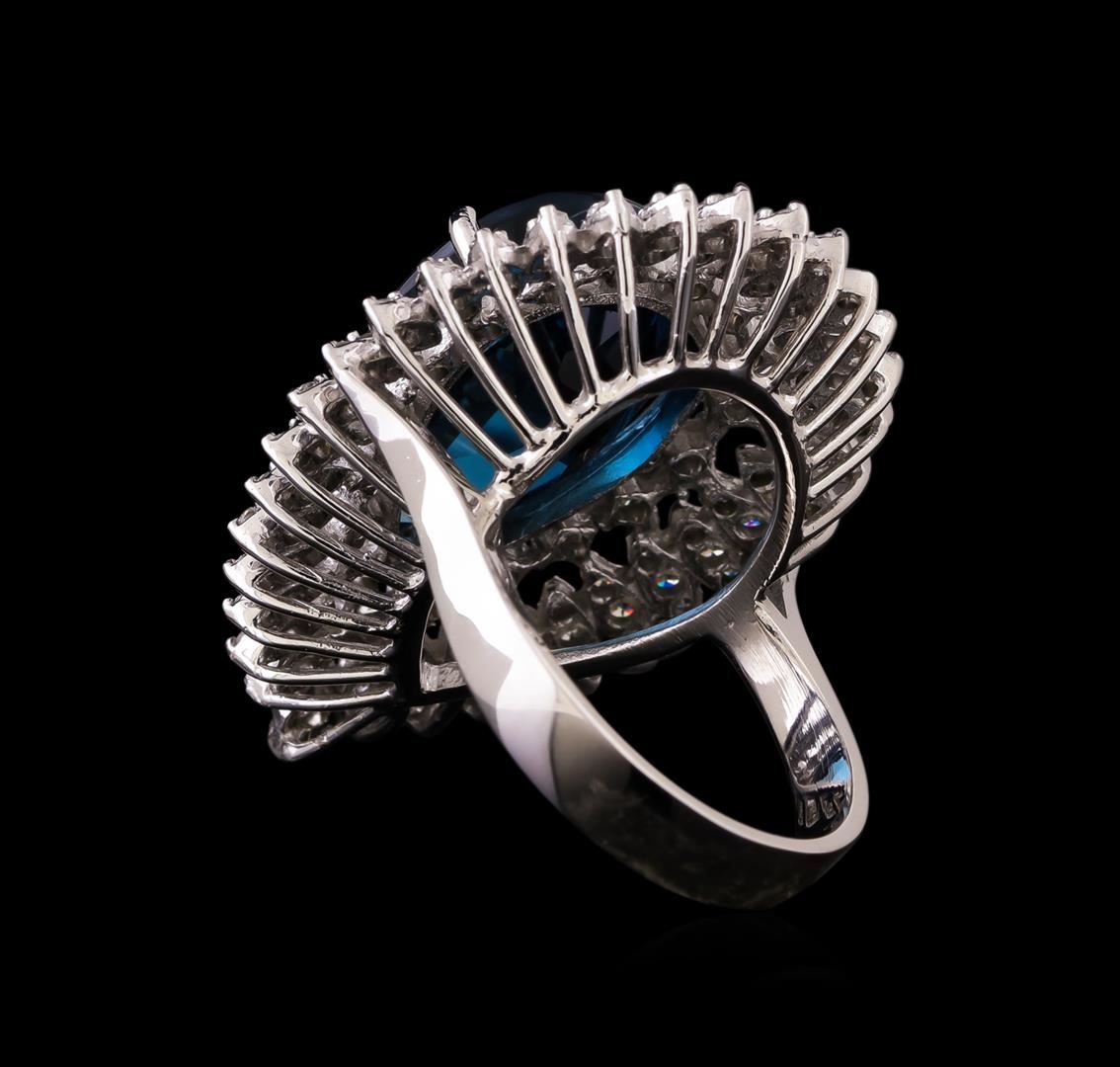 One electronically tested 14KT white gold ladies cast topaz and diamond ring with a bright polish finish. Identified with markings of "14K". Condition is new. Containing: One prong set oval modified brilliant cut natural blue topaz, measuring 18.34 x 12.91 x 8.39mm, approximate weight of 14.73ct., clarity is eye clean, type I, medium dark, moderately strong, greenish blue color, (GIA gB 6/4), cut is good. One Hundred Ten prong set round brilliant cut diamonds, measuring 1.80 - 1.30 x 0.93mm (depth est.) approximate total weight of 110 Stones = 1.50ct. Clarity: SI-1 to I-1. Color: I - J, Cut is Good. Colored gemstones are presumed to have been subjected to commonly used enhancement processes. All diamonds and colored gemstones are graded in the mounting, unless otherwise stated. Total Weight of Colored Stones 14.73ct. Total Weight of Diamonds 1.50ct. Total Weight of Ring 13.80 grams. GGL Appraised.