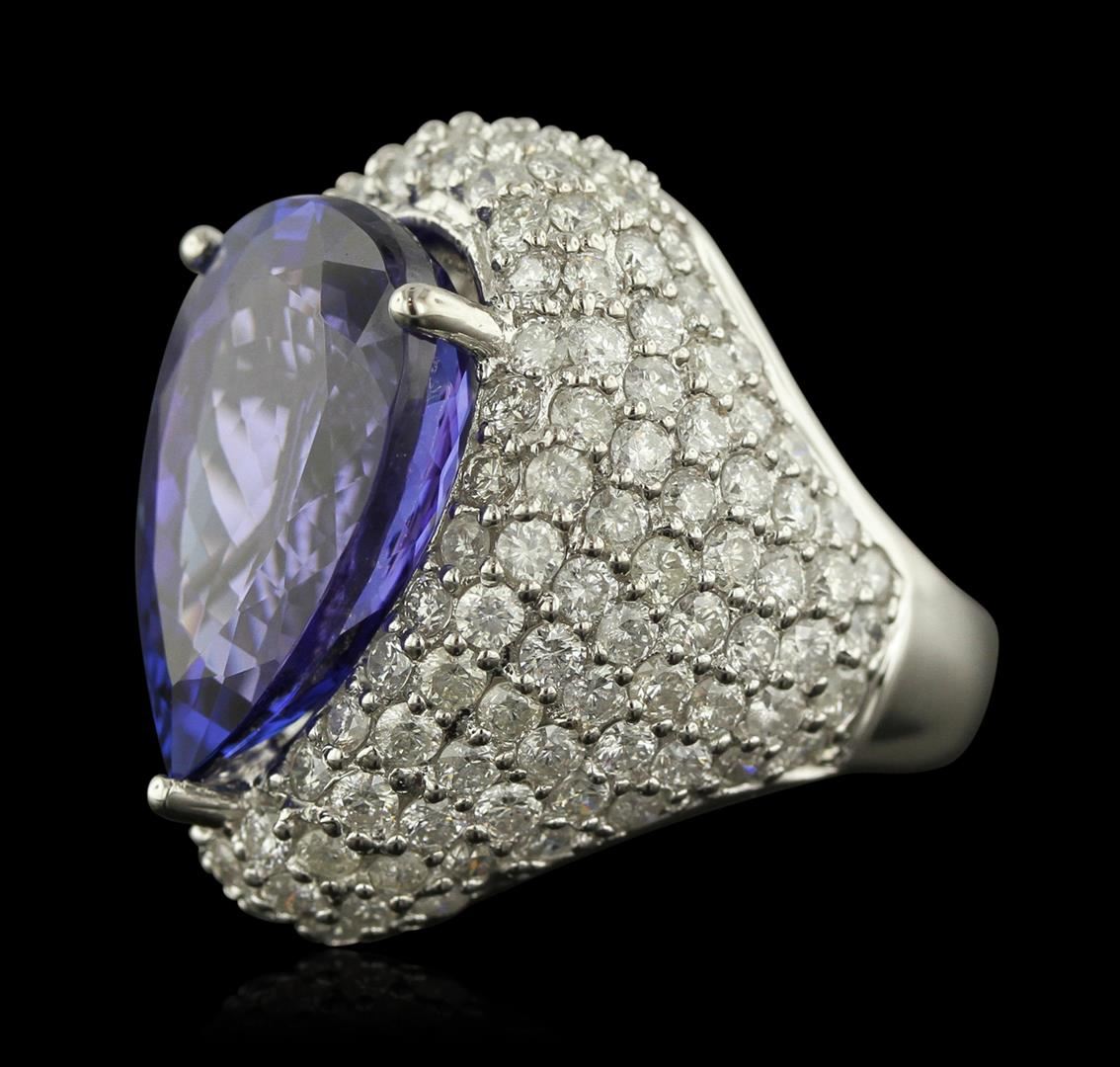One electronically tested 14KT white gold Ladies combination cast & assembled fancy ring with a high polish finish. Condition is new. Identified with markings of "14K". Containing: One Hundred Fifty-Four prong set round brilliant cut diamonds, measuring 2.20 - 2.20 x 1.32mm (depth est.) approximate. Total Weight of 154 Stones = 5.37ct. Clarity: SI-2 to I-2. Color: H - I, Cut is Good. One prong set pear modified brilliant cut natural tanzanite, measuring 19.10 x 12.80 x 8.50mm, approximate weight of 14.82ct., clarity is eye clean, type I, medium, moderately strong, bluish violet color, (GIA bV 5/4), cut is very good. GIA Report: 2151964685.Total Weight of Colored Stones 14.82ct. Total Weight of Diamonds 5.37ct. Total Weight of Ring 16.10 grams. GGL Appraised at $33,895.00.