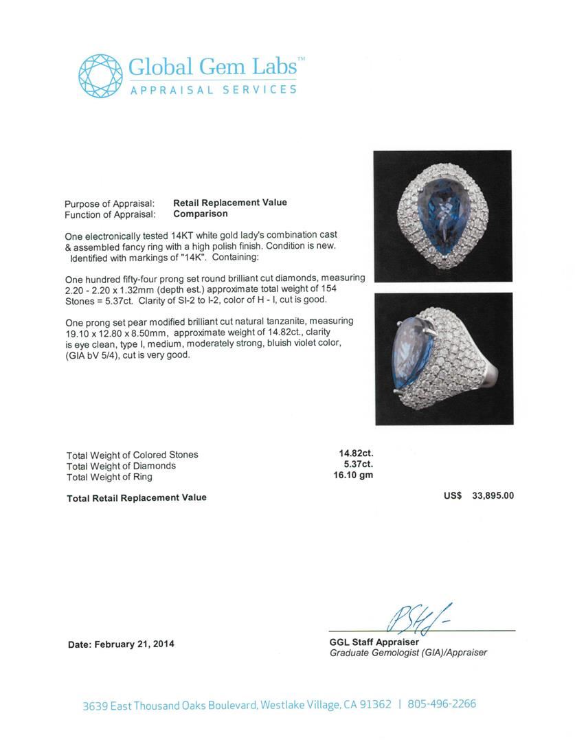 One electronically tested 14KT white gold Ladies combination cast & assembled fancy ring with a high polish finish. Condition is new. Identified with markings of "14K". Containing: One Hundred Fifty-Four prong set round brilliant cut diamonds, measuring 2.20 - 2.20 x 1.32mm (depth est.) approximate. Total Weight of 154 Stones = 5.37ct. Clarity: SI-2 to I-2. Color: H - I, Cut is Good. One prong set pear modified brilliant cut natural tanzanite, measuring 19.10 x 12.80 x 8.50mm, approximate weight of 14.82ct., clarity is eye clean, type I, medium, moderately strong, bluish violet color, (GIA bV 5/4), cut is very good. GIA Report: 2151964685.Total Weight of Colored Stones 14.82ct. Total Weight of Diamonds 5.37ct. Total Weight of Ring 16.10 grams. GGL Appraised.
