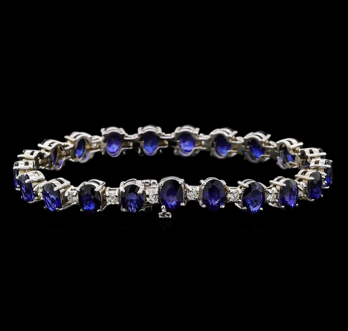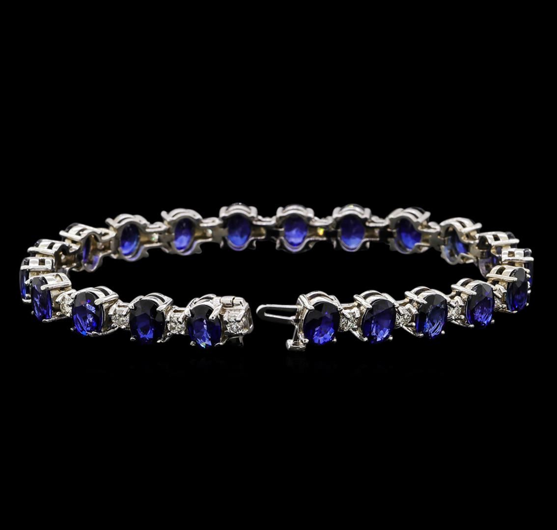 One electronically tested 14KT white gold ladies cast sapphire and diamond bracelet with a hidden box clasp with safety closer with a bright polish finish. Measurements: 7" in length Identified with markings of "14K". Condition is new. Containing: Twenty-one prong set oval modified brilliant cut natural blue sapphires, measuring 6.90 x 5.00 x 2.50mm, approximate total weight of 15.12ct., clarity is moderately included, type II, medium, moderately strong, blue color, (GIA B 5/4), cut is good. Twenty-One prong set round brilliant cut diamonds, measuring 2.80 - 2.80 x 1.68mm (depth est.) approximate total weight of 21 Stones = 1.69ct. Clarity of SI-1 to SI-2, Color of I - J, Cut is Good. Colored gemstones are presumed to have been subjected to commonly used enhancement processes. All diamonds and colored gemstones are graded in the mounting, unless otherwise stated. Total Weight of Colored Stones 15.12ct. Total Weight of Diamonds 1.69ct. Total Weight of Bracelet 19.20 grams. GGL Appraised at $9,345.00.
