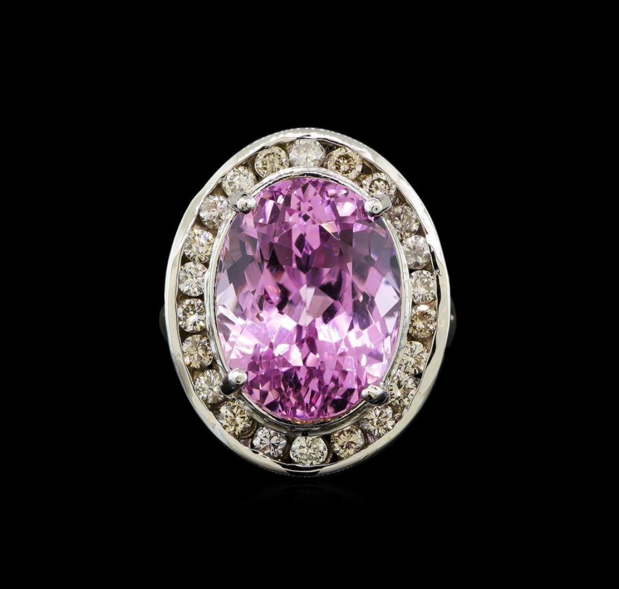 One electronically tested 14KT white gold ladies cast kunzite and diamond ring with a bright polish finish. The featured kunzite is set within a diamond bezel, completed by a three and one-half millimeter wide band. Identified with markings of "14K". Condition is new, good workmanship. Containing: One prong set oval mixed cut natural kunzite, measuring 15.80 x 12.20 x 11.15mm, 15% bulge factor, approximate weight of 16.20ct., clarity is eye clean, type I, medium light, very slightly grayish, reddish purple color, (GIA rP 4/3), cut is good. Transmitting light with no distortion, transparent. Colored Stone Grading Report attached. Graded in the setting. Twenty-Two channel set round brilliant cut diamonds, measuring 2.20 - 2.10 x 1.29mm (depth est.) approximate total weight of 22 Stones = 0.90ct. Graded in the setting. Clarity: SI-1 to SI-2. Color: H - J. Total Weight of Colored Stones 16.20ct. Total Weight of Diamonds 0.90ct. AIG Appraised at $9,005.00.