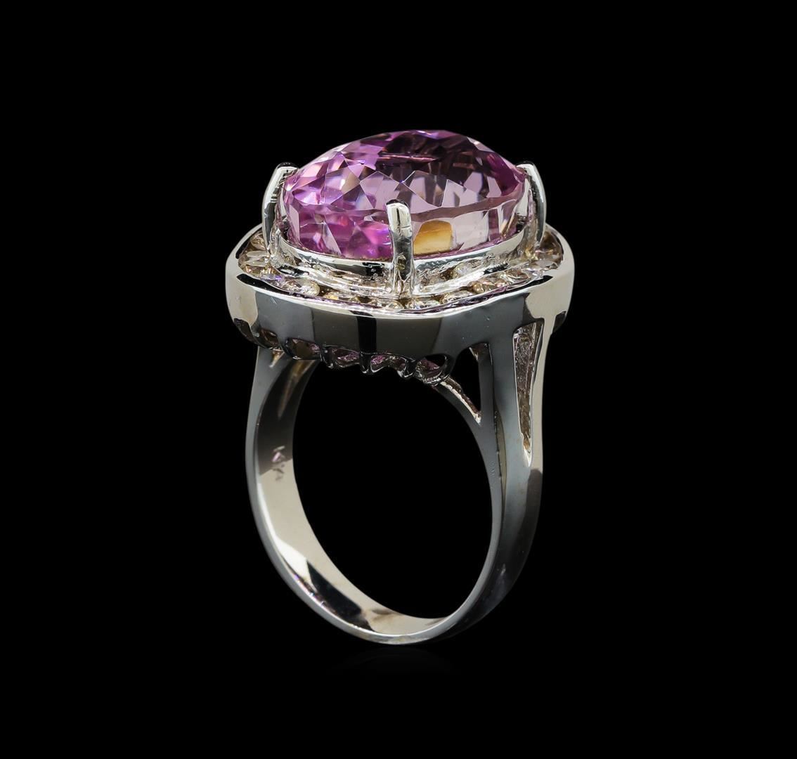 One electronically tested 14KT white gold ladies cast kunzite and diamond ring with a bright polish finish. The featured kunzite is set within a diamond bezel, completed by a three and one-half millimeter wide band. Identified with markings of "14K". Condition is new, good workmanship. Containing: One prong set oval mixed cut natural kunzite, measuring 15.80 x 12.20 x 11.15mm, 15% bulge factor, approximate weight of 16.20ct., clarity is eye clean, type I, medium light, very slightly grayish, reddish purple color, (GIA rP 4/3), cut is good. Transmitting light with no distortion, transparent. Colored Stone Grading Report attached. Graded in the setting. Twenty-Two channel set round brilliant cut diamonds, measuring 2.20 - 2.10 x 1.29mm (depth est.) approximate total weight of 22 Stones = 0.90ct. Graded in the setting. Clarity: SI-1 to SI-2. Color: H - J. Total Weight of Colored Stones 16.20ct. Total Weight of Diamonds 0.90ct. AIG Appraised.