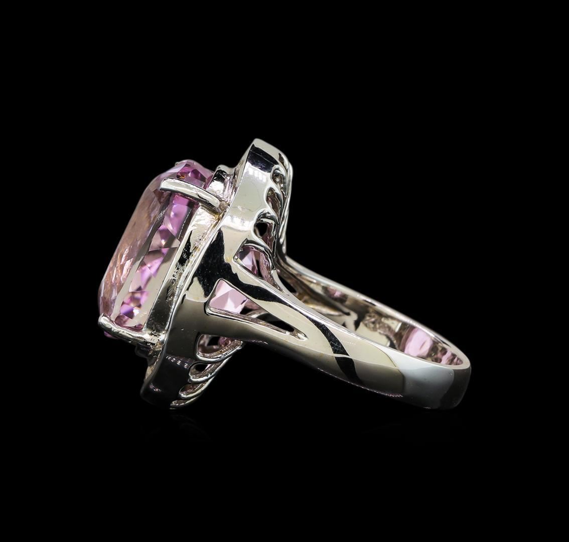 One electronically tested 14KT white gold ladies cast kunzite and diamond ring with a bright polish finish. The featured kunzite is set within a diamond bezel, completed by a three and one-half millimeter wide band. Identified with markings of "14K". Condition is new, good workmanship. Containing: One prong set oval mixed cut natural kunzite, measuring 15.80 x 12.20 x 11.15mm, 15% bulge factor, approximate weight of 16.20ct., clarity is eye clean, type I, medium light, very slightly grayish, reddish purple color, (GIA rP 4/3), cut is good. Transmitting light with no distortion, transparent. Colored Stone Grading Report attached. Graded in the setting. Twenty-Two channel set round brilliant cut diamonds, measuring 2.20 - 2.10 x 1.29mm (depth est.) approximate total weight of 22 Stones = 0.90ct. Graded in the setting. Clarity: SI-1 to SI-2. Color: H - J. Total Weight of Colored Stones 16.20ct. Total Weight of Diamonds 0.90ct. AIG Appraised.