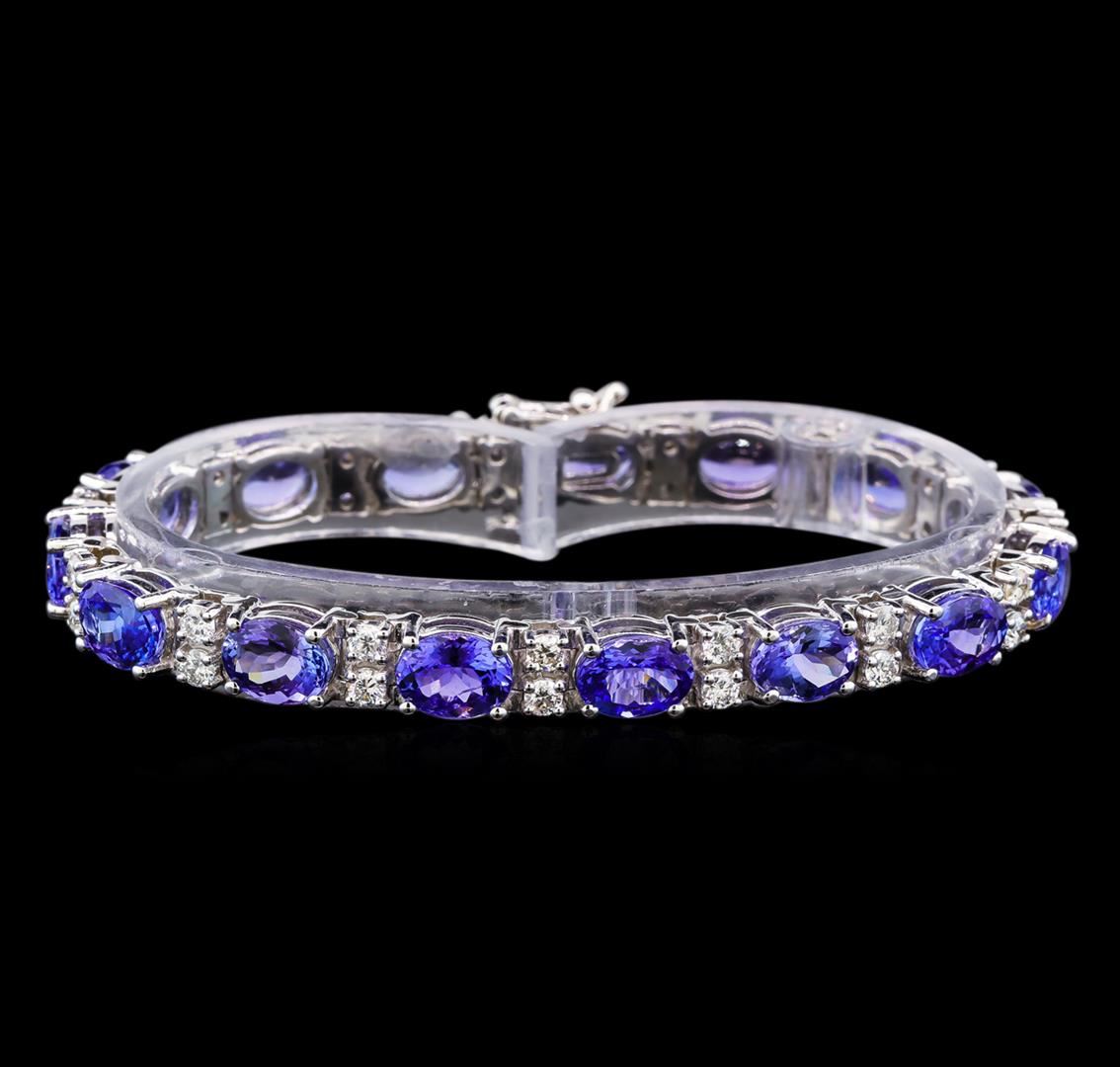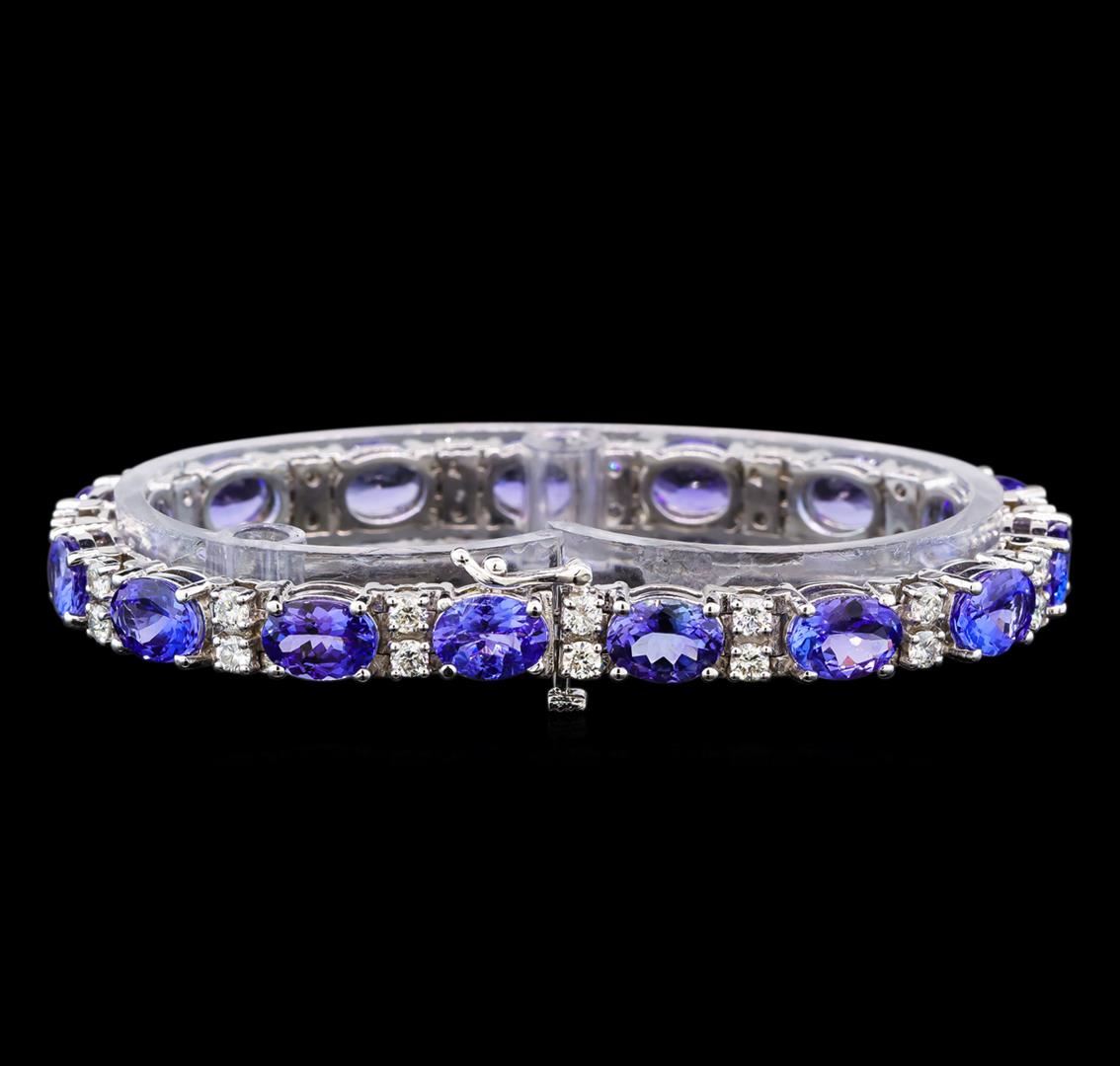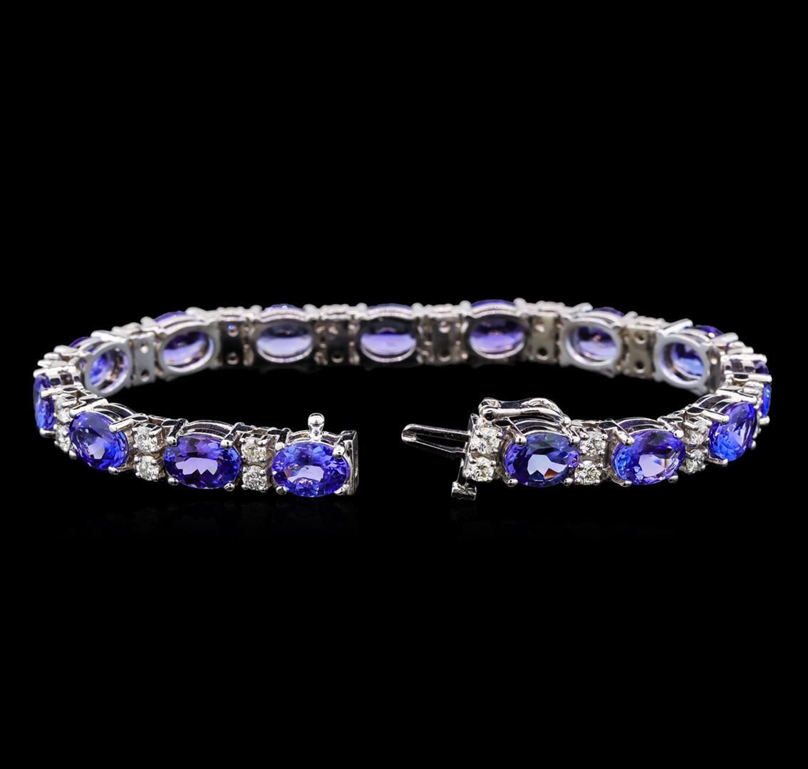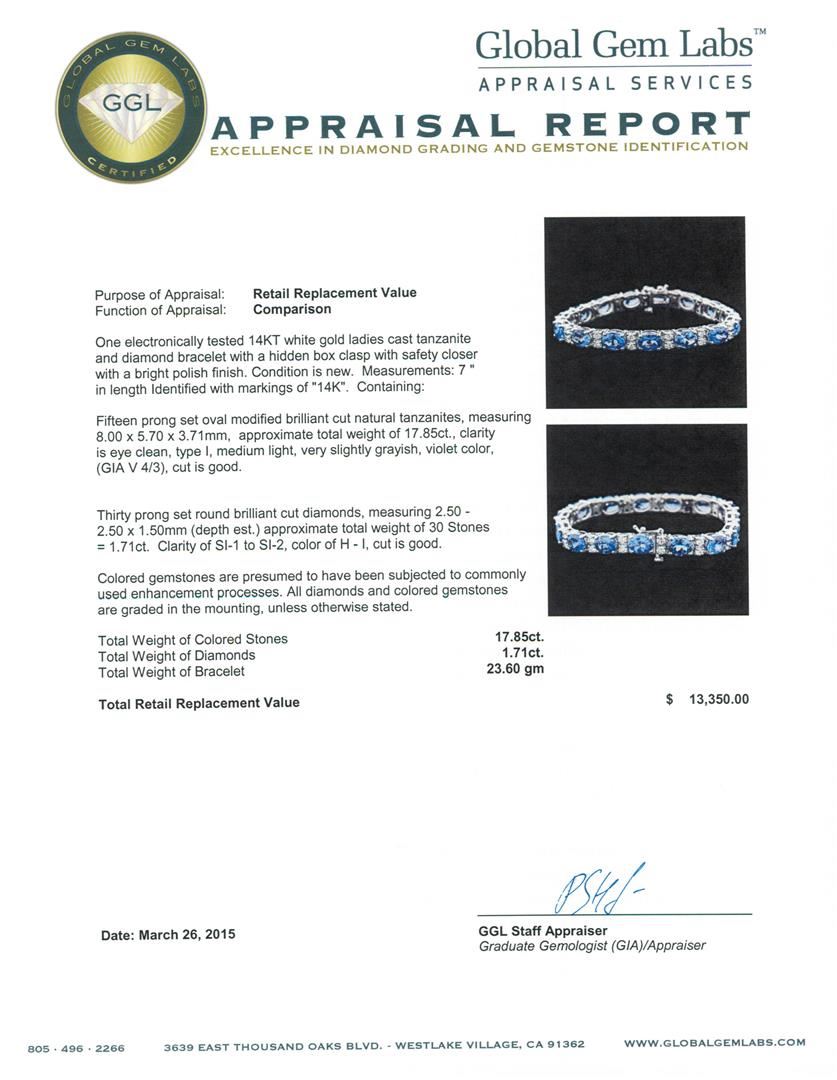 One electronically tested 14KT white gold ladies cast tanzanite and diamond bracelet with a hidden box clasp with safety closer with a bright polish finish. Measurements: 7 " in length Identified with markings of "14K". Condition is new. Containing: Fifteen prong set oval modified brilliant cut natural tanzanites, measuring 8.00 x 5.70 x 3.71mm, approximate total weight of 17.85ct., clarity is eye clean, type I, medium light, very slightly grayish, violet color, (GIA V 4/3), cut is good. Thirty prong set round brilliant cut diamonds, measuring 2.50 - 2.50 x 1.50mm (depth est.) approximate total weight of 30 Stones = 1.71ct. Clarity: SI-1 to SI-2. Color: H - I, Cut is Good. Colored gemstones are presumed to have been subjected to commonly used enhancement processes. All diamonds and colored gemstones are graded in the mounting, unless otherwise stated. Total Weight of Colored Stones 17.85ct. Total Weight of Diamonds 1.71ct. Total Weight of Bracelet 23.60 grams. GGL Appraised at $13,350.00.