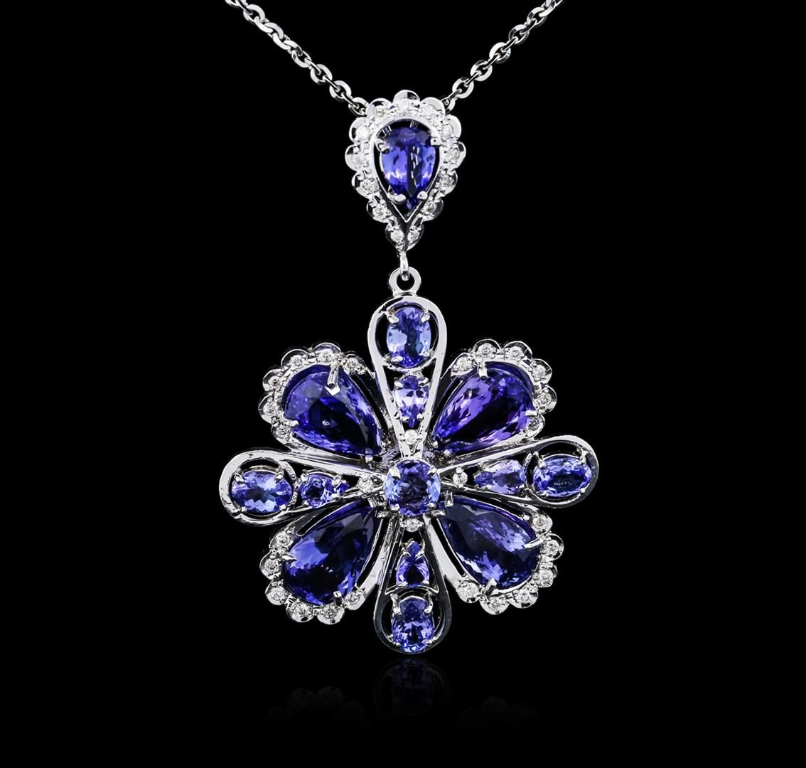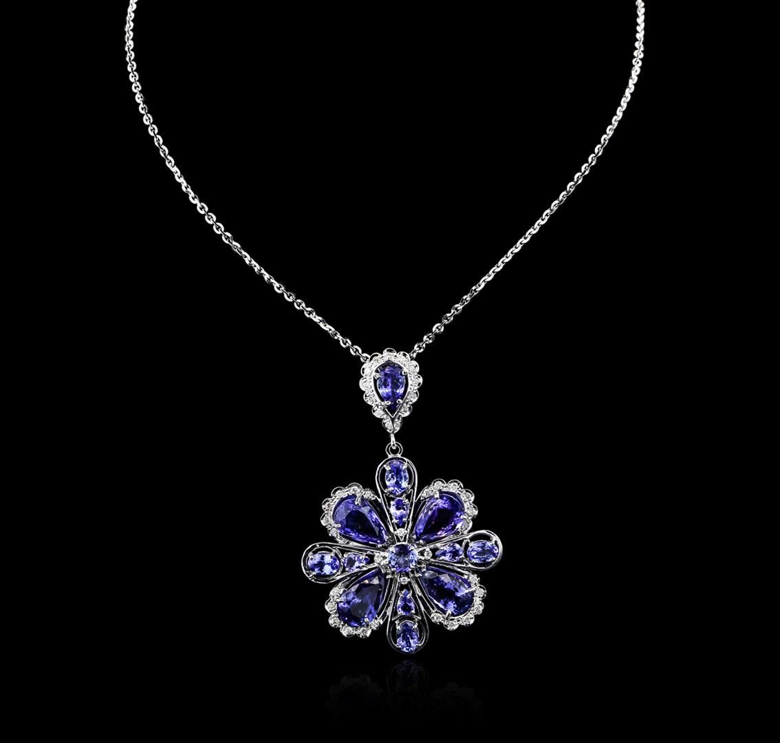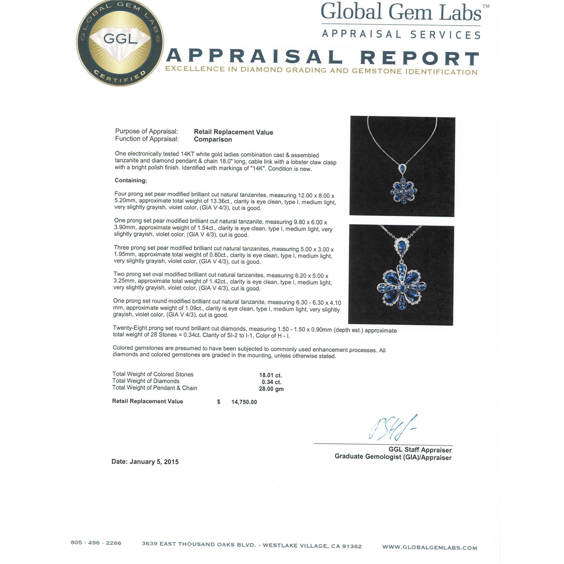 One electronically tested 14KT white gold ladies combination cast & assembled tanzanite and diamond pendant & chain 18.0" long, cable link with a lobster claw clasp with a bright polish finish. Identified with markings of "14K". Condition is new. Containing: Four prong set pear modified brilliant cut natural tanzanites, measuring 12.00 x 8.00 x 5.20mm, approximate total weight of 13.36ct., clarity is eye clean, type I, medium light, very slightly grayish, violet color, (GIA V 4/3), cut is good. One prong set pear modified brilliant cut natural tanzanite, measuring 9.80 x 6.00 x 3.90mm, approximate weight of 1.54ct., clarity is eye clean, type I, medium light, very slightly grayish, violet color, (GIA V 4/3), cut is good. Three prong set pear modified brilliant cut natural tanzanites, measuring 5.00 x 3.00 x 1.95mm, approximate total weight of 0.60ct., clarity is eye clean, type I, medium light, very slightly grayish, violet color, (GIA V 4/3), cut is good. Two prong set oval modified brilliant cut natural tanzanites, measuring 6.20 x 5.00 x 3.25mm, approximate total weight of 1.42ct., clarity is eye clean, type I, medium light, very slightly grayish, violet color, (GIA V 4/3), cut is good. One prong set round modified brilliant cut natural tanzanite, measuring 6.30 - 6.30 x 4.10 mm, approximate weight of 1.09ct., clarity is eye clean, type I, medium light, very slightly grayish, violet color, (GIA V 4/3), cut is good. Twenty-Eight prong set round brilliant cut diamonds, measuring 1.50 - 1.50 x 0.90mm (depth est.) approximate total weight of 28 Stones = 0.34ct. Clarity: SI-2 to I-1. Color: H - I. Colored gemstones are presumed to have been subjected to commonly used enhancement processes. All diamonds and colored gemstones are graded in the mounting, unless otherwise stated. Total Weight of Colored Stones 18.01ct. Total Weight of Diamonds 0.34ct. Total Weight of Pendant & Chain 28.00 grams. GGL Appraised at $14,750.00.