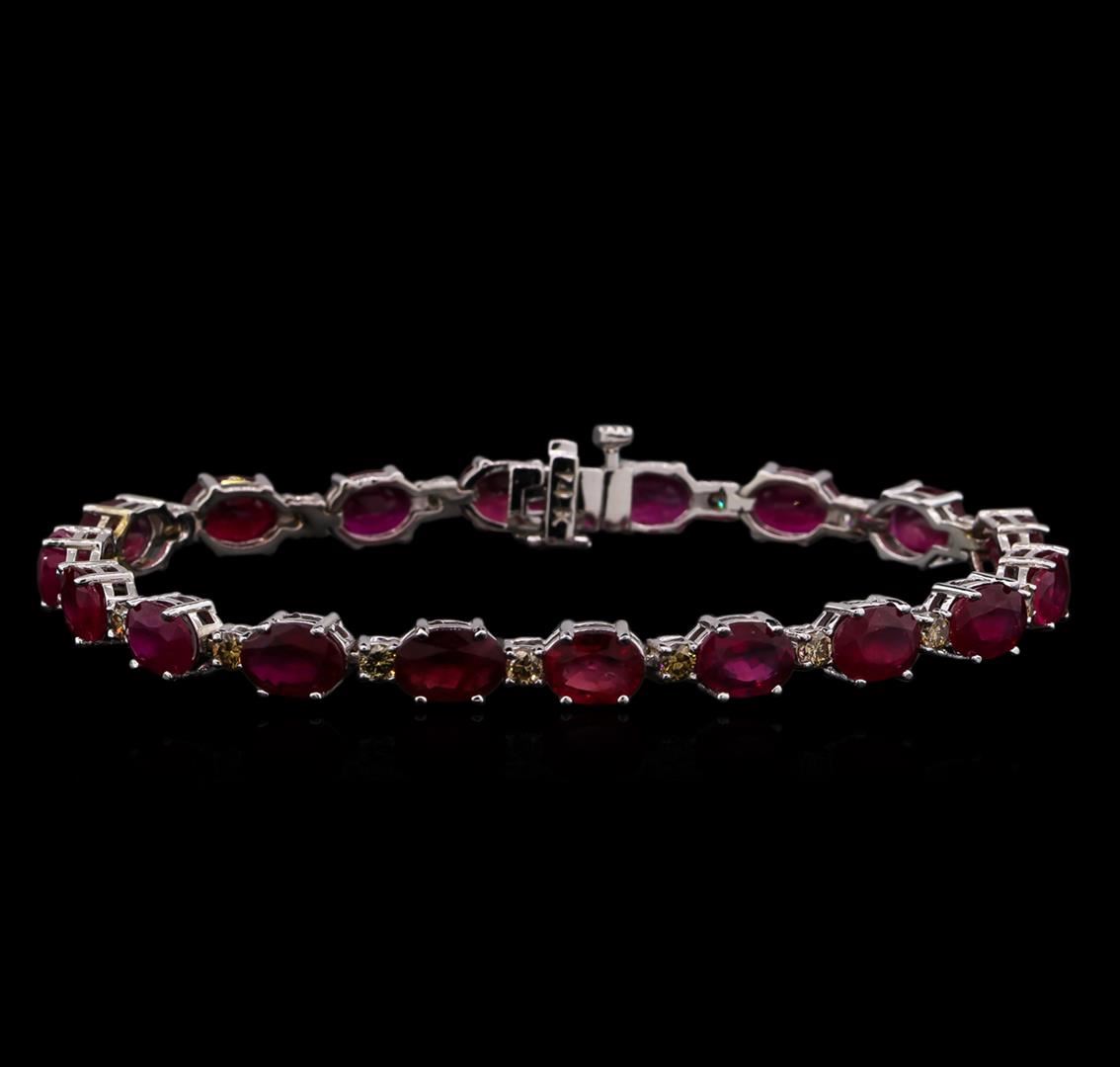 One electronically tested 14KT white gold ladies cast & assembled ruby and diamond bracelet with a bright polish finish. Condition is new, good workmanship. Seven inch length bracelet features a flexible ribbon of rubies alternated by diamonds terminating in a concealed clasp with safety bar. Identified with markings of "14K". Containing: Eighteen prong set oval mixed cut natural rubies, measuring 7.00 x 5.00 x 3.25mm, 8%. bulge factor, approximate. Total Weight of 18.18ct., clarity is heavily included, type II, medium dark, moderately strong, slightly purplish red color, (GIA slpR 6/4), cut is good. Transmitting light somewhat diffusely, transparent to translucent. Naturally occurring internal & external characteristics are present. Indications of laboratory high temperature heat treatment, with glass & flux additives. Measurements & the color grade are an average for the group. Graded in the setting. Ruby has a low tolerance to rhodium plating, repolishing the surface, & ultrasonic cleaning. Eighteen prong set round brilliant cut diamonds, measuring 2.70 - 2.60 x 1.59mm (depth est.) approximate. Total Weight of 18 Stones = 1.32ct. Color grade is an average for the group. Graded in the setting. Clarity: SI-1 to I-1. Total Weight of Colored Stones 18.18ct. Total Weight of Diamonds 1.32ct. Total Weight of Bracelet 12.10 grams. AIG Appraised at $5,445.00.