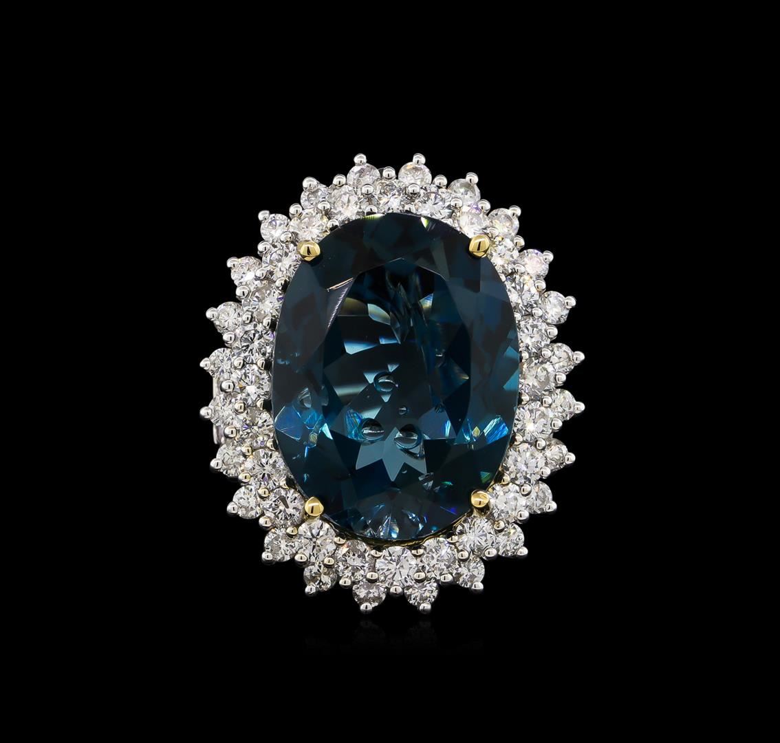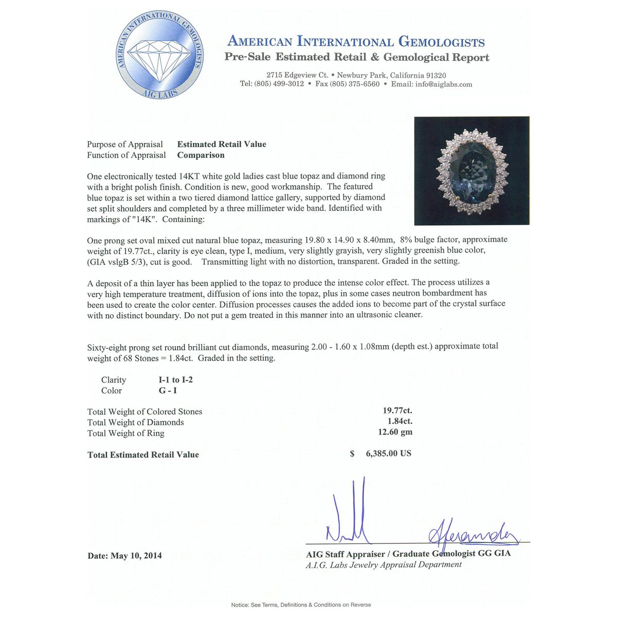 One electronically tested 14KT white gold ladies cast blue topaz and diamond ring with a bright polish finish. Condition is new, good workmanship. The featured blue topaz is set within a two tiered diamond lattice gallery, supported by diamond set split shoulders and completed by a three millimeter wide band. Identified with markings of "14K". Containing: One prong set oval mixed cut natural blue topaz, measuring 19.80 x 14.90 x 8.40mm, 8%. bulge factor, approximate weight of 19.77ct., clarity is eye clean, type I, medium, very slightly grayish, very slightly greenish blue color, (GIA vslgB 5/3), cut is good. Transmitting light with no distortion, transparent. Graded in the setting. A deposit of a thin layer has been applied to the topaz to produce the intense color effect. The process utilizes a very high temperature treatment, diffusion of ions into the topaz, plus in some cases neutron bombardment has been used to create the color center. Diffusion processes causes the added ions to become part of the crystal surface with no distinct boundary. Do not put a gem treated in this manner into an ultrasonic cleaner. Sixty-Eight prong set round brilliant cut diamonds, measuring 2.00 - 1.60 x 1.08mm (depth est.) approximate. Total Weight of 68 Stones = 1.84ct. Graded in the setting. Clarity: I-1 to I-2. Color: G - I. Total Weight of Colored Stones 19.77ct. Total Weight of Diamonds 1.84ct. Total Weight of Ring 12.60grams. AIG Appraised at $6,385.00.