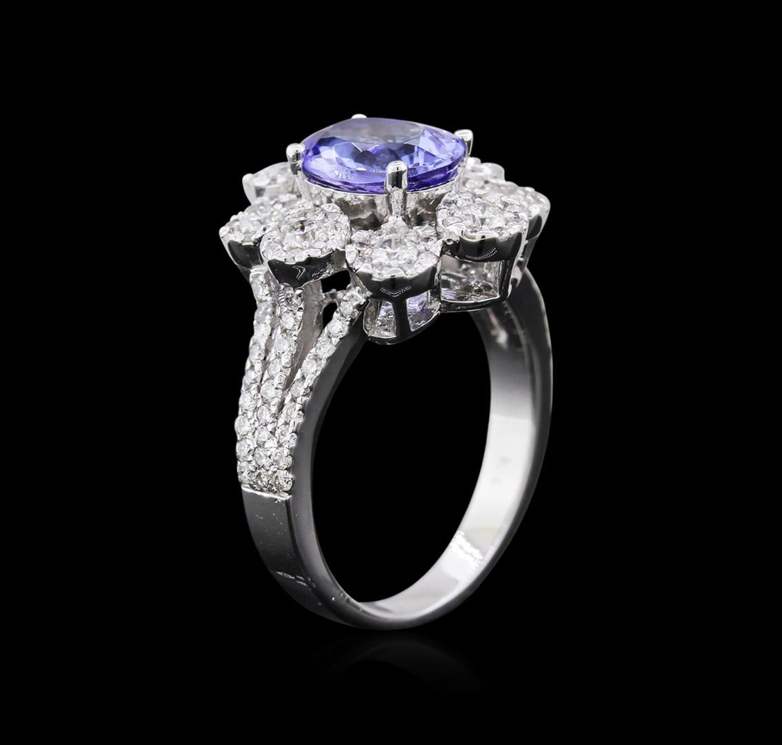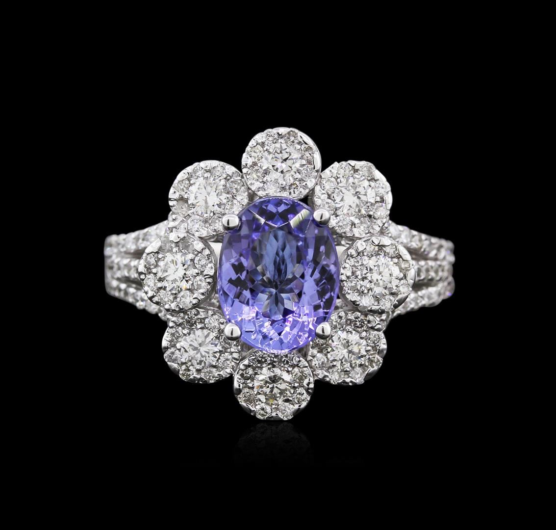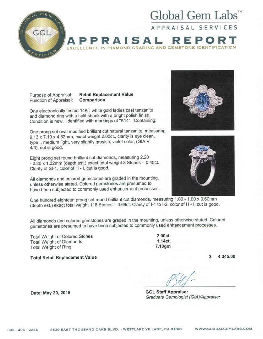 One electronically tested 14KT white gold ladies cast tanzanite and diamond ring with a split shank with a bright polish finish. Identified with markings of "K14". Condition is new. Containing: One prong set oval modified brilliant cut natural tanzanite, measuring 9.13 x 7.10 x 4.62mm, exact weight 2.00ct., clarity is eye clean, type I, medium light, very slightly grayish, violet color, (GIA V 4/3), cut is good. Eight prong set round brilliant cut diamonds, measuring 2.20 - 2.20 x 1.32mm (depth est.) exact total weight 8 Stones = 0.45ct. Clarity: SI-1. Color: H - I, Cut is Good. All diamonds and colored gemstones are graded in the mounting, unless otherwise stated. Colored gemstones are presumed to have been subjected to commonly used enhancement processes. One Hundred Eighteen prong set round brilliant cut diamonds, measuring 1.00 - 1.00 x 0.60mm (depth est.) exact total weight 118 Stones = 0.69ct. Clarity: I-1 to I-2. Color: H - I, Cut is Good. All diamonds and colored gemstones are graded in the mounting, unless otherwise stated. Colored gemstones are presumed to have been subjected to commonly used enhancement processes. Total Weight of Colored Stones 2.00ct. Total Weight of Diamonds 1.14ct. Total Weight of Ring 7.10 grams. GGL Appraised at $4,345.00.