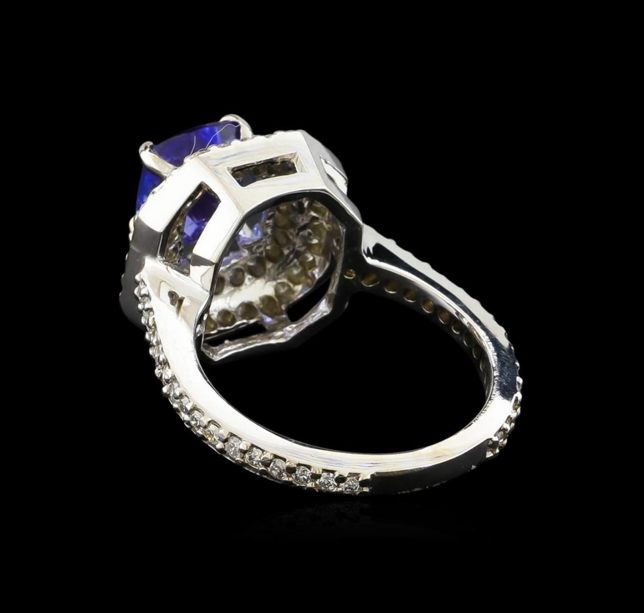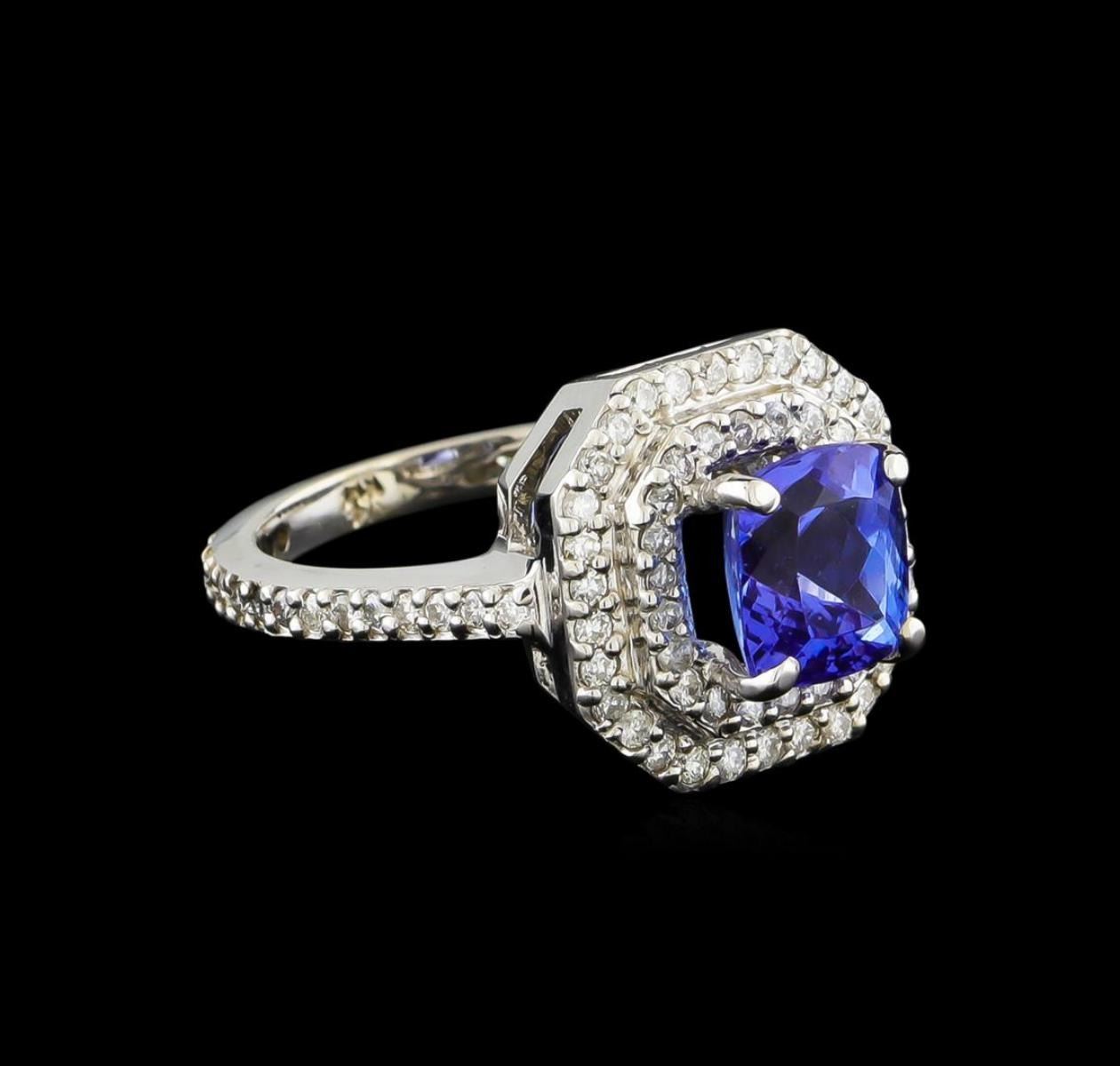 One electronically tested 14KT white gold ladies combination cast & assembled tanzanite and diamond ring with a flat shank with a bright polish finish. Identified with markings of "14K". Condition is new. Containing: One prong set square cushion modified brilliant cut natural tanzanite, measuring 7.72 x 6.90 x 4.75mm, approximate weight of 2.00 ct., clarity is eye clean, type I, medium light, very slightly grayish, violet color, (GIA V 4/3), cut is good. Eighty-Five prong set round brilliant cut diamonds, measuring 1.30 - 1.30 x 0.78mm (depth est.) approximate total weight of 85 Stones = 0.68ct. Clarity: I-1 to I-2. Color: I - J, Cut is Good. Colored gemstones are presumed to have been subjected to commonly used enhancement processes. All diamonds and colored gemstones are graded in the mounting, unless otherwise stated. Total Weight of Colored Stones 2.00 ct. Total Weight of Diamonds 0.68ct. Total Weight of Ring 5.20 grams. GGL Appraised.